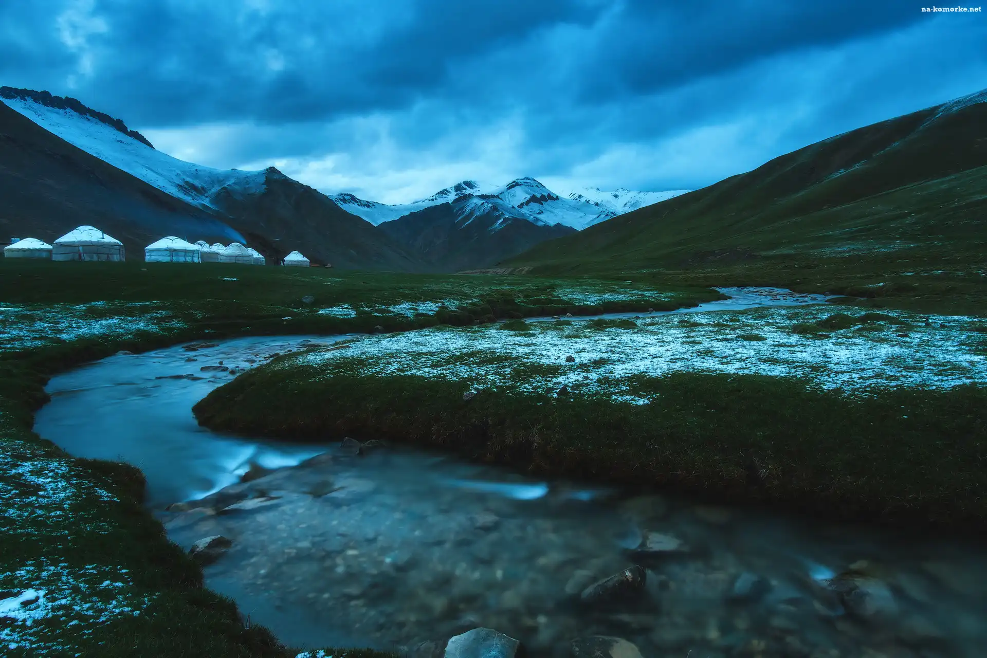 Góry, Obwód naryński, Kirgistan, Rzeka, Śnieg, Trawa, Tash Rabat na Komórkę