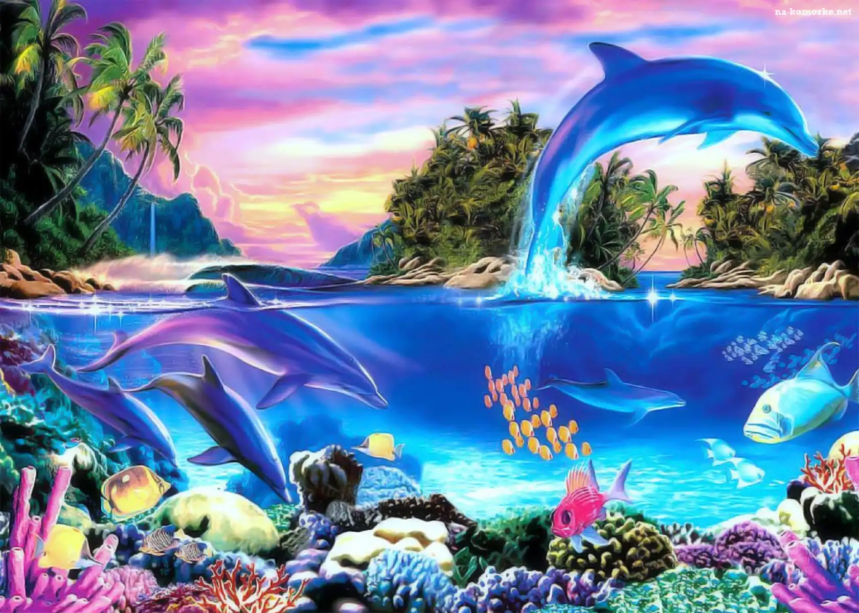 Dwa, Delfiny, Morze Ryby, Lilie, Grafika Rafa, Rybki, Ocean, Kolorowe Rybki, Błazenki, Ukwiały Rafa, Koralowa, Ryby Dwie, Kolorowe, Rybki Morze, Skały, Ryby Delfiny, Promienie, Słoneczne Rybka, Akwarium
