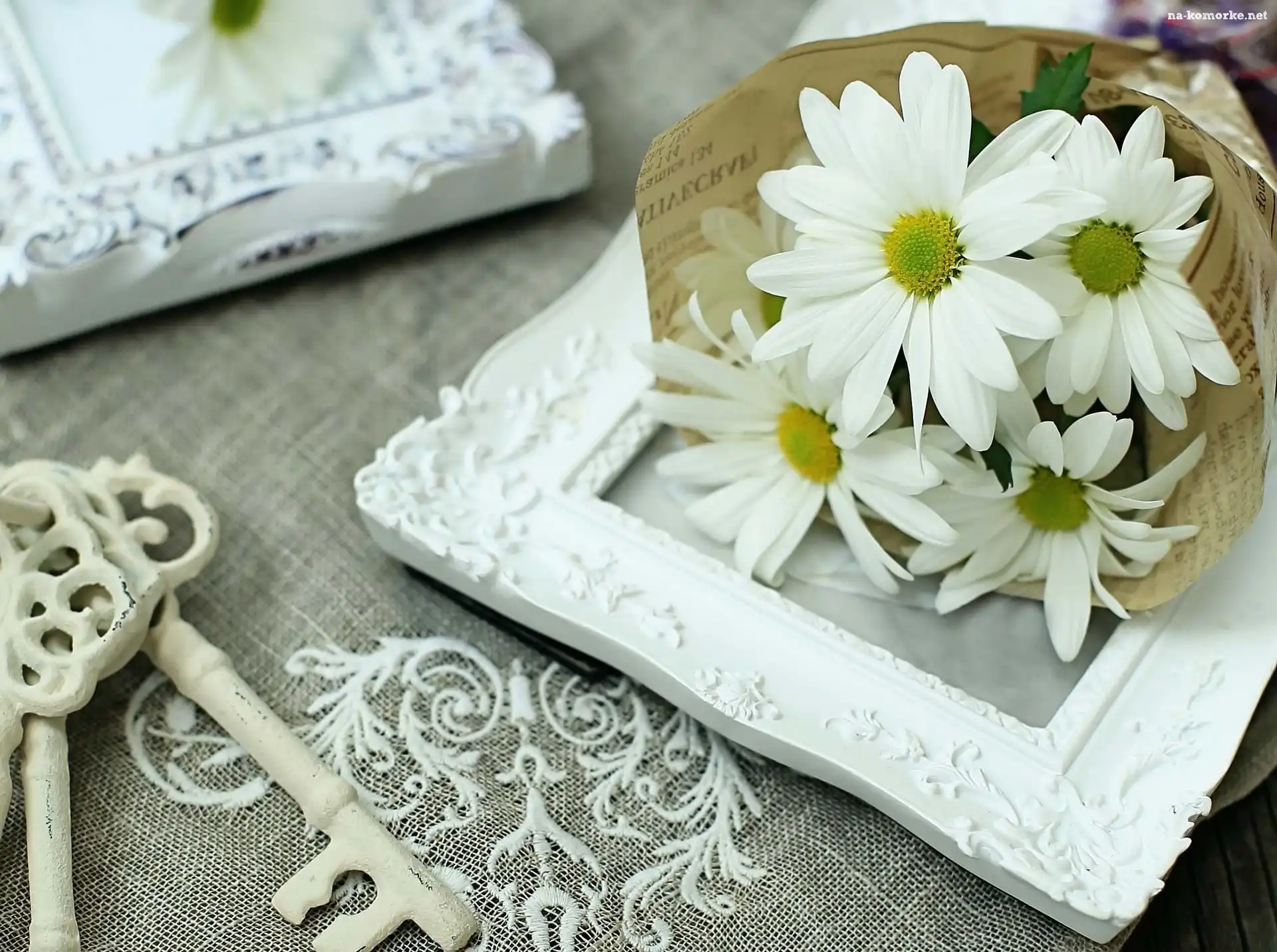 Ramki, Biale, Kwiaty, Kompozycja, Margerytki, Klucze na Komórkę