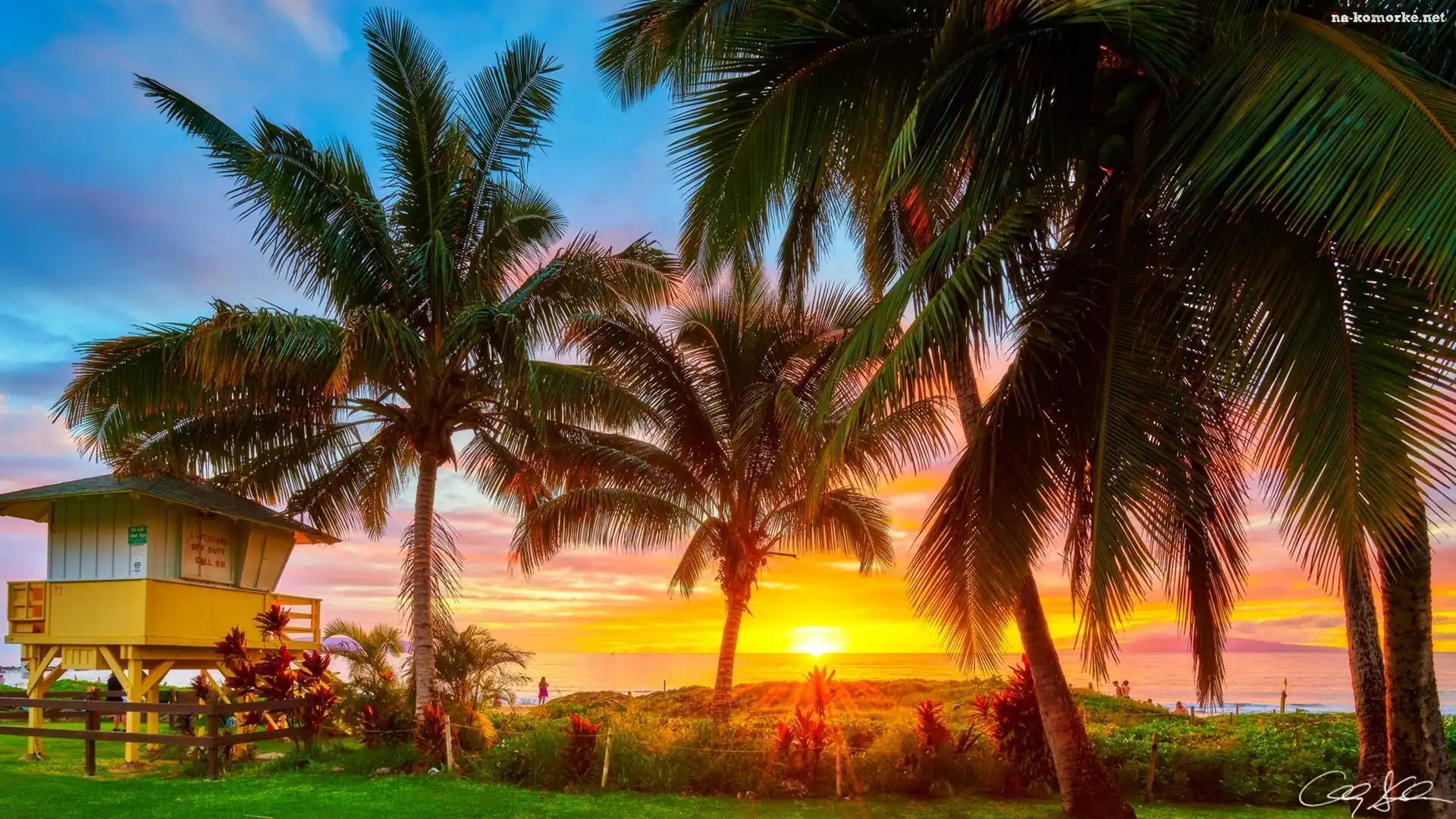 Wieża ratownicza, Hawaje, Morze, Palmy, Wschód słońca na Komórkę