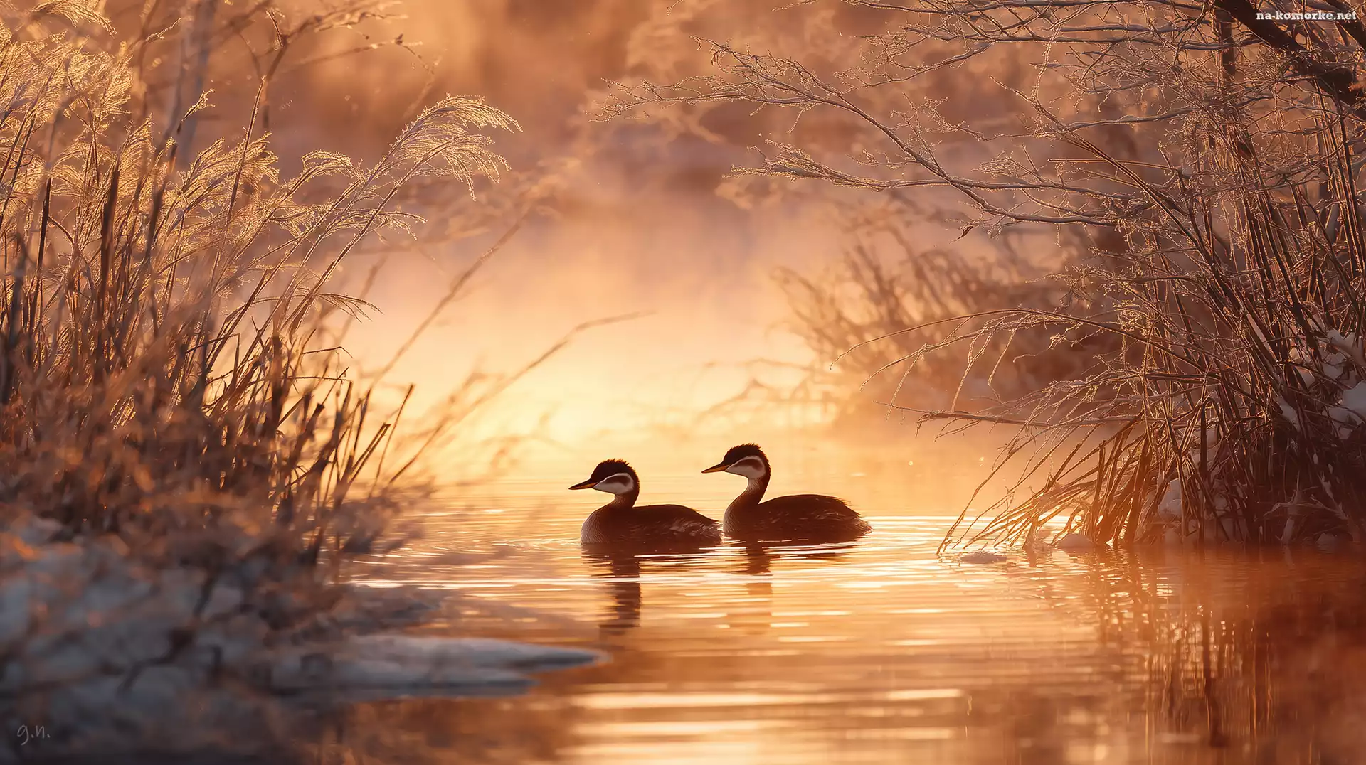 Grafika AI, Dwa, Zarośla, Roślinność, Woda, Perkozy rdzawoszyje na Komórkę