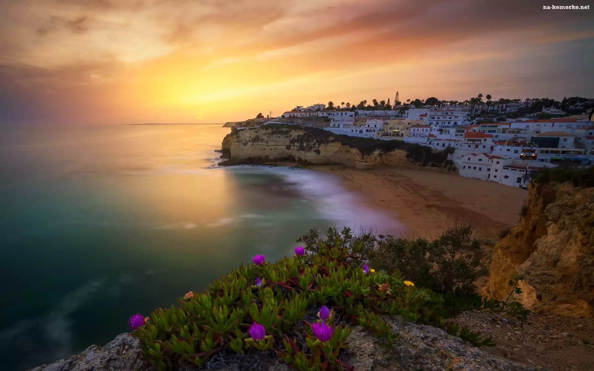 Region Algarve, Domy, Wybrzeże, Portugalia, Kwiaty, Zachód słońca, Morze, Carvoeiro na Komórkę