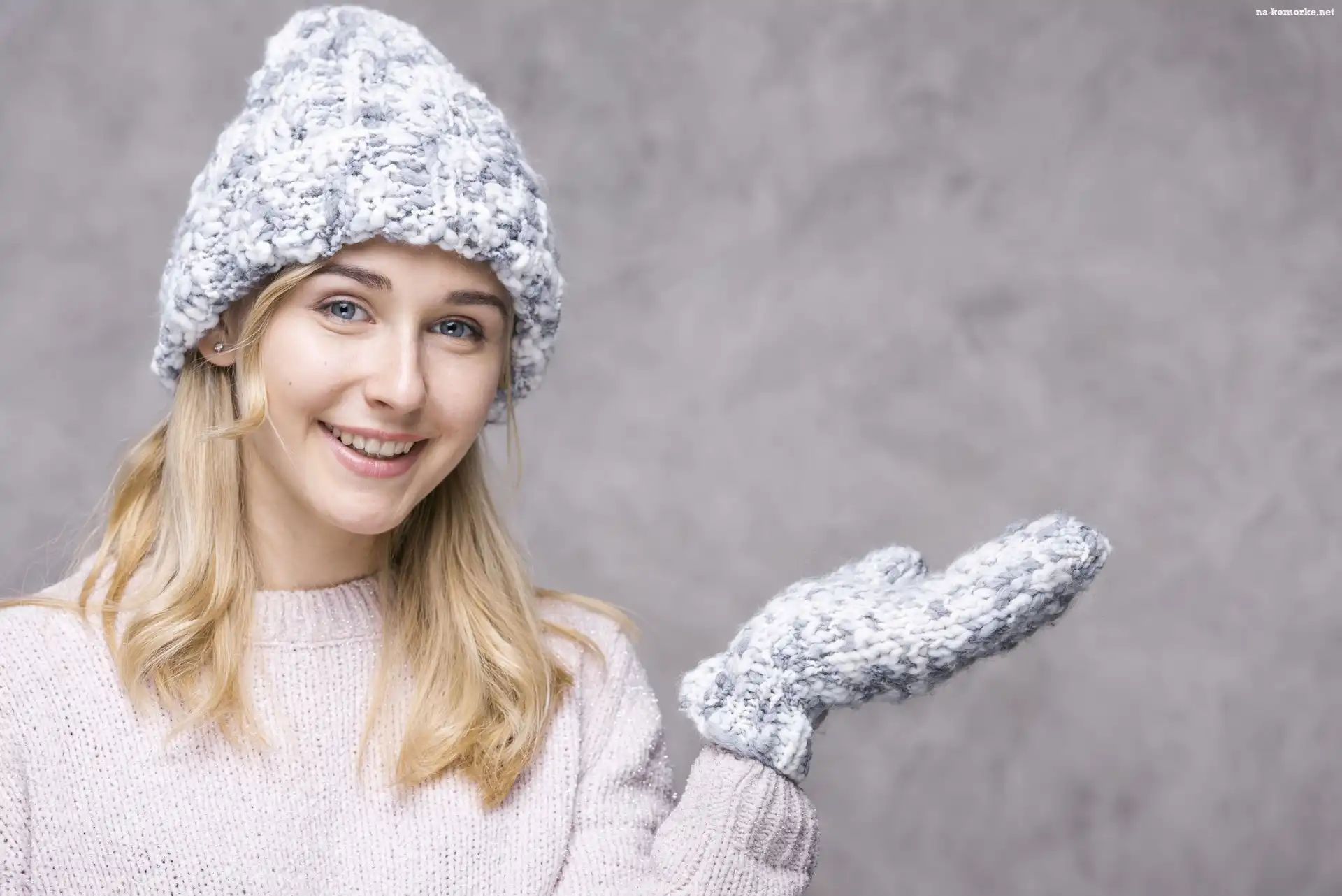 Dziewczyna, Ręka, Rękawiczka, Blondynka, Uśmiech, Czapka, Sweter na Komórkę