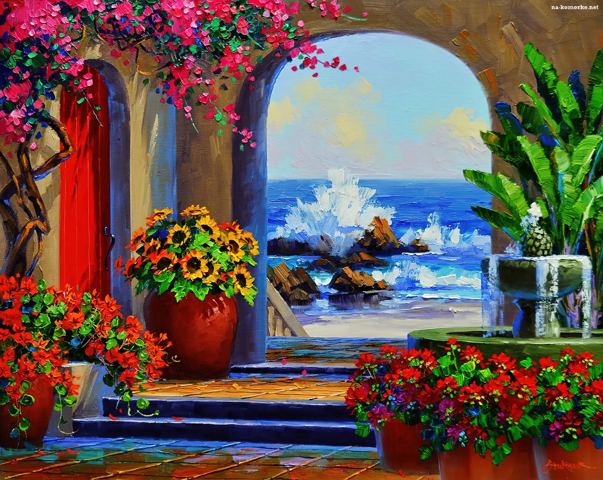 Reprodukcje Obrazów, Weranda, Kwiaty, Morze na Komórkę