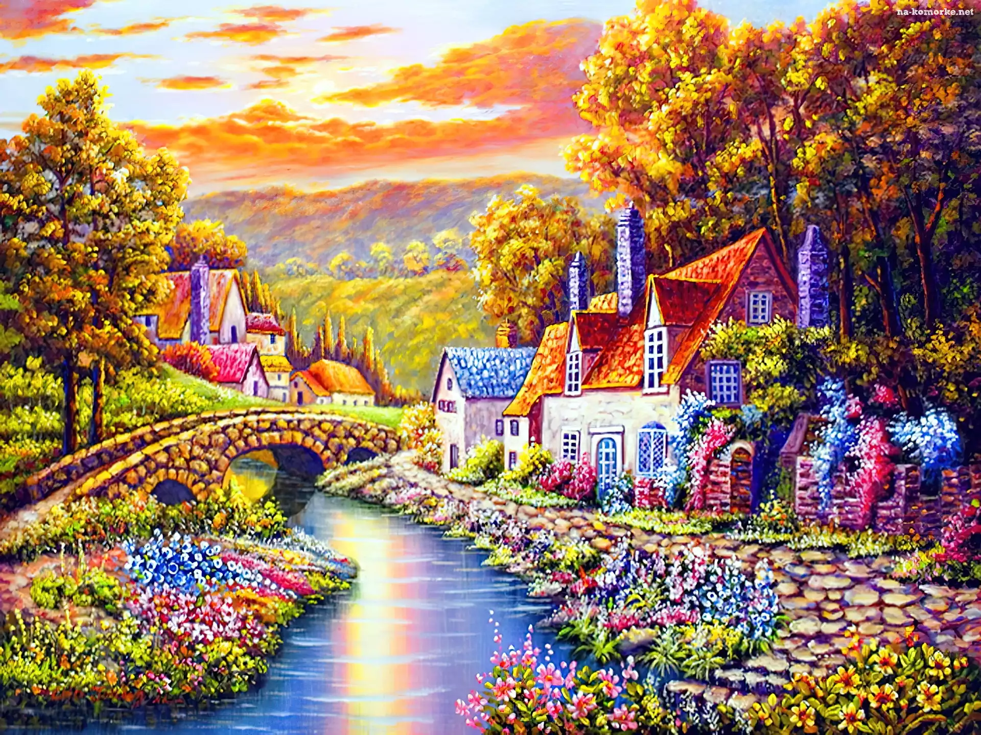 Reprodukcje Obrazów, Dom, Rzeka, Most, Niebo na Komórkę