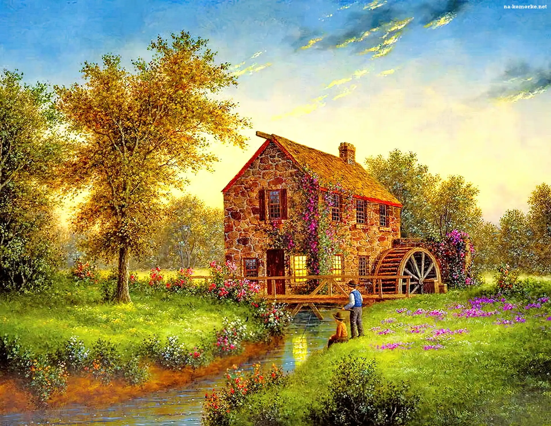 Reprodukcje Obrazów, Młyn, Łąka, Rzeka, Dziecko na Komórkę