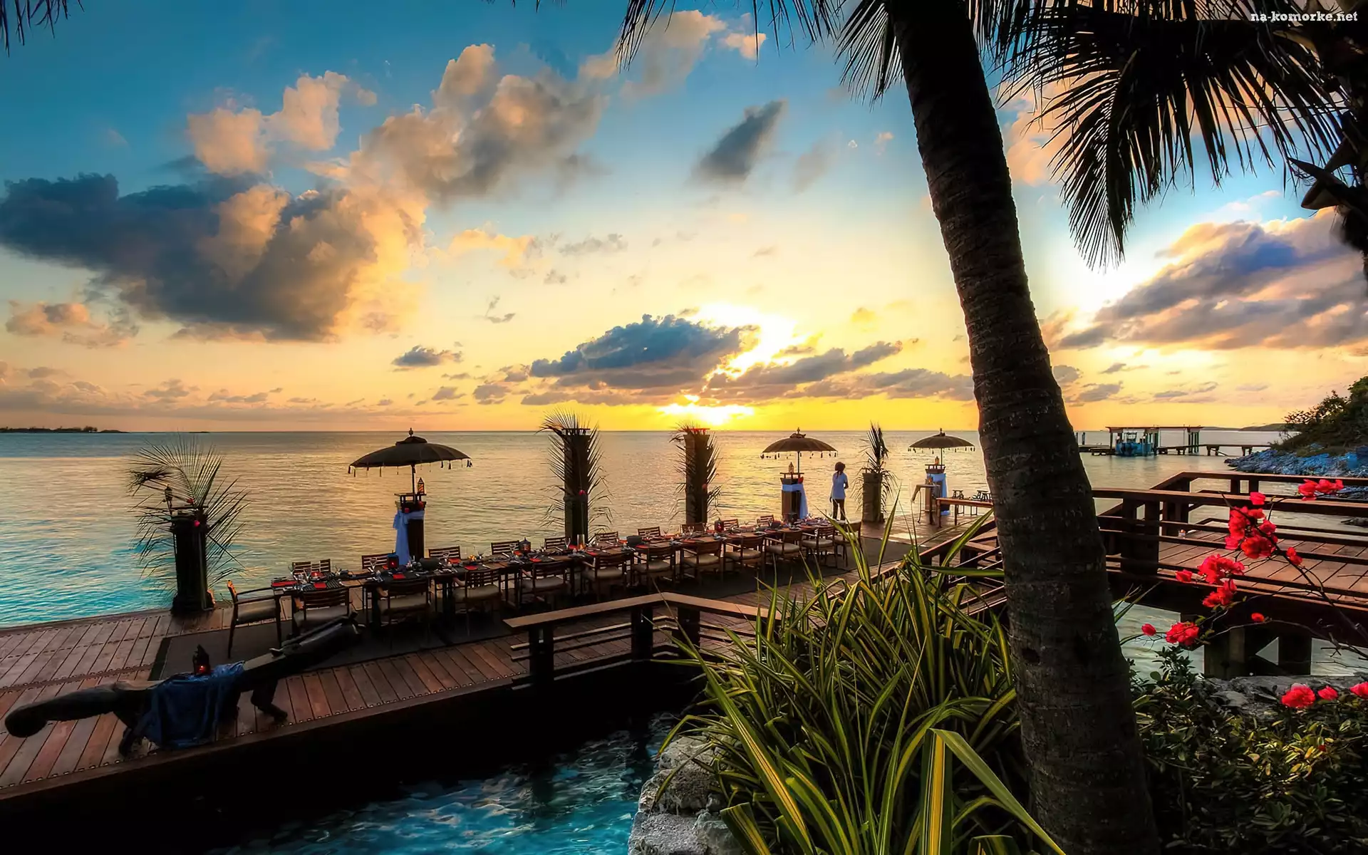 Restauracja, Morze, Zachód, Słońca, Molo na Komórkę