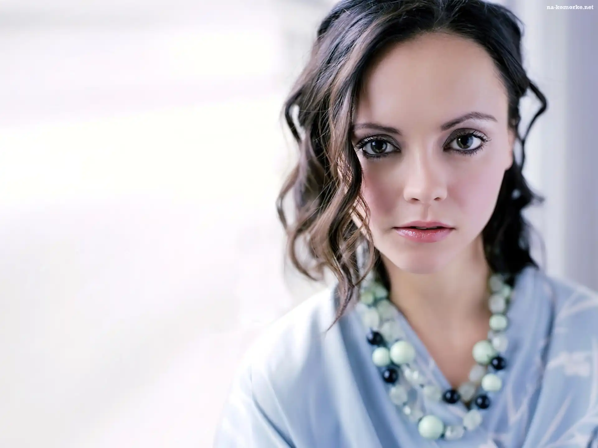 Christina Ricci, kapelusz Christina Ricci, naszyjnik Christina Ricci, czarna, bluzka Christina Ricci, korale buzia, Christina Ricci krótkie, Christina Ricci, proste, włosy Christina Ricci, język Christina Ricci, czerwony, pasek