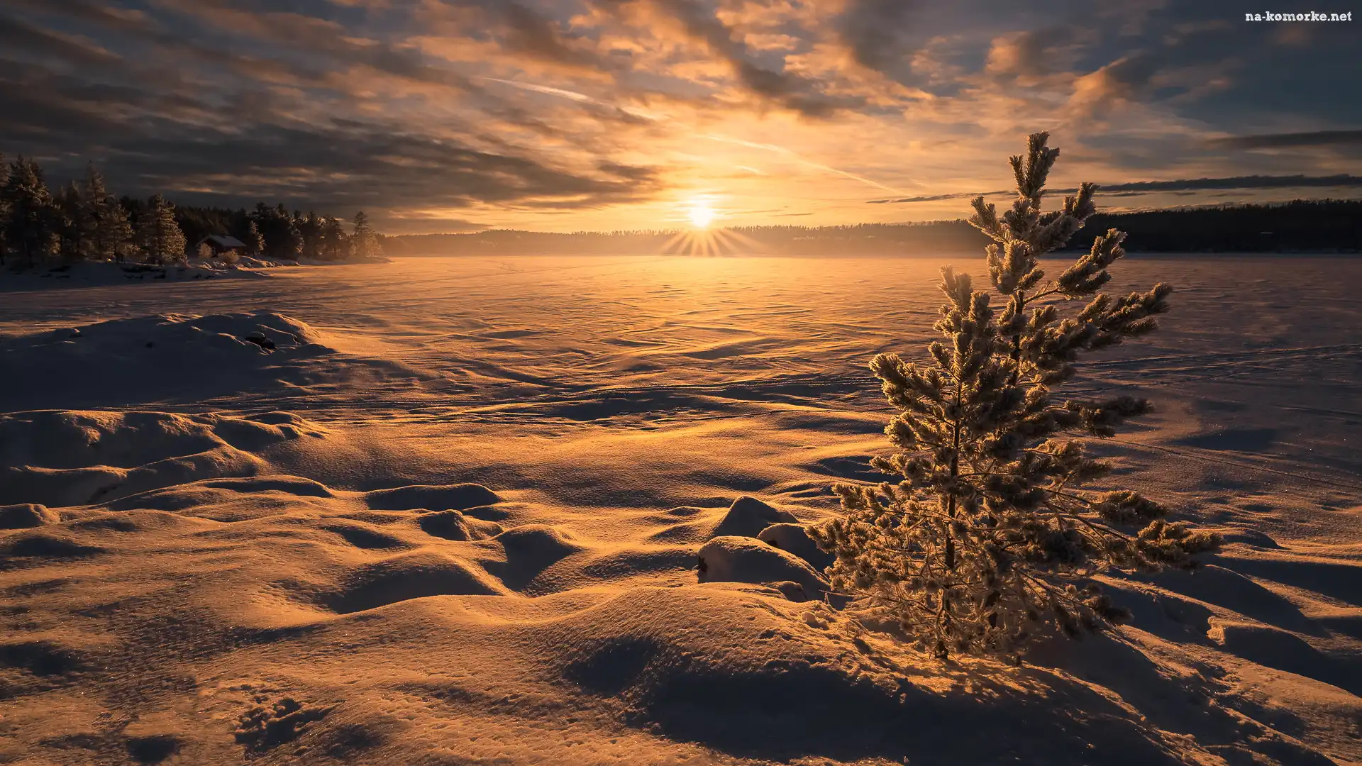 Zima, Ringerike, Norwegia, Zachód słońca, Zaśnieżone, Jezioro, Drzewa na Komórkę