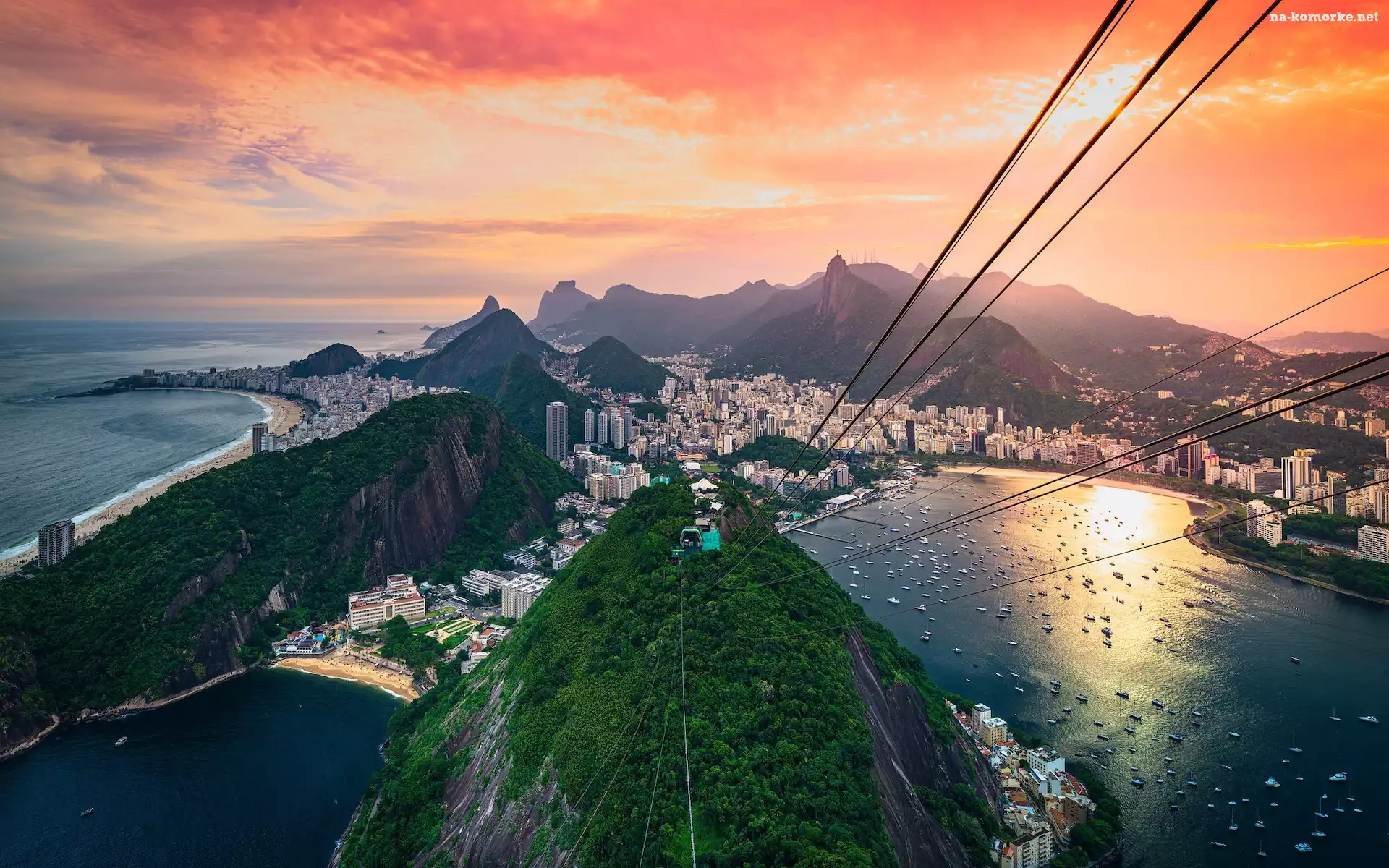 Kolejka linowa, Miasto, Zachód słońca, Morze, Góry, Rio de Janeiro, Brazylia, Z lotu ptaka, Wieżowce na Komórkę |