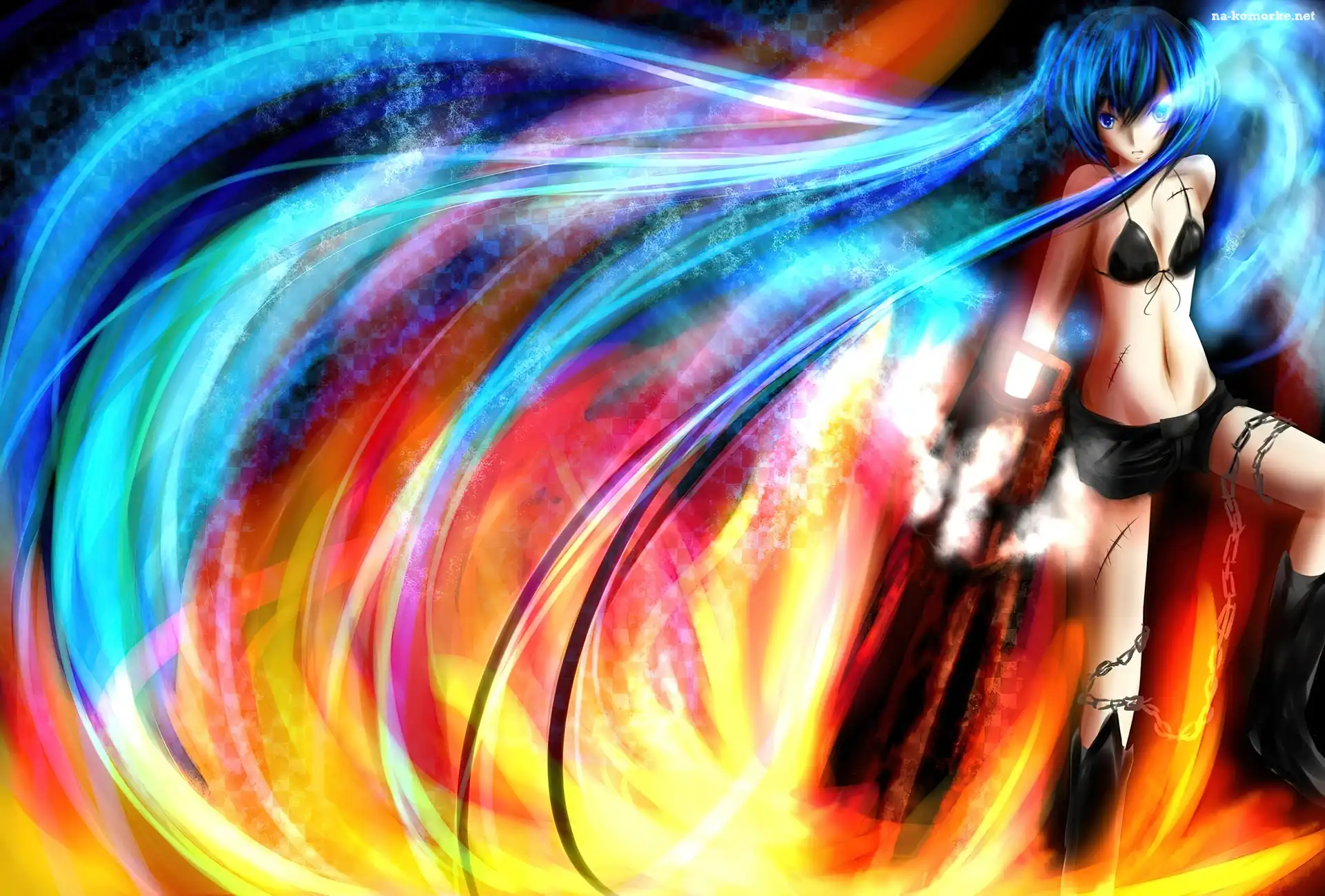 Black Rock Shooter, Oko, Planeta Black Rock Shooter Black Rock Shooter, Miecz Dziewczyna, Woda, Black Rock Shooter Łańcuch, Miecz, Black Rock Shooter Black Rock Shooter Black Rock Shooter, Włosy, Anime, Dziewczyna Black Rock Shooter, Płaszczyk, Spodenki, Stanik Black Rock Shooter, Pasek, Łańcuchy, Wieżowce Black Rock Shooter, Łańcuchy Black Rock Shooter