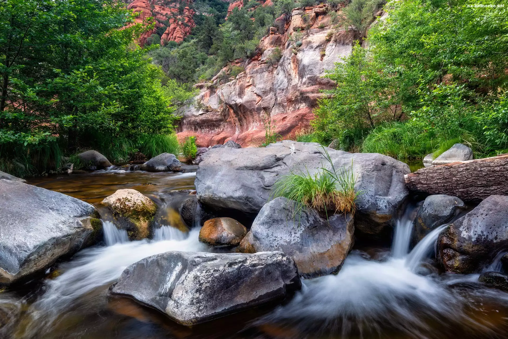 Arizona, Sedona, Cathedral Rock, Kamienie, Drzewa, Skały, Oak Creek, Głazy, Rzeka, Stany Zjednoczone na Komórkę |