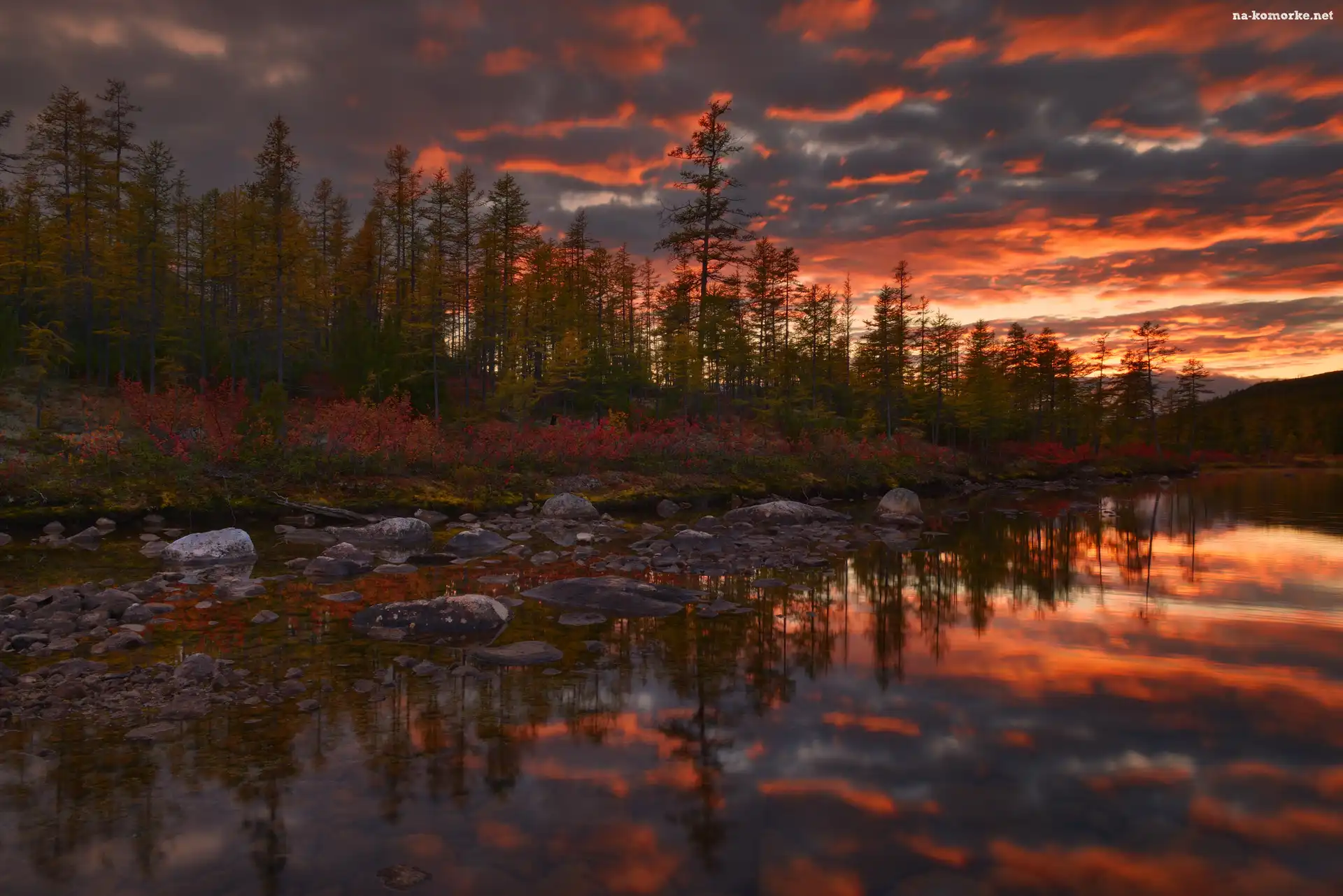 Jesień, Kamienie, Rosja, Drzewa, Jezioro Jack London, Kołyma, Niebo, Zachód Słońca na Komórkę
