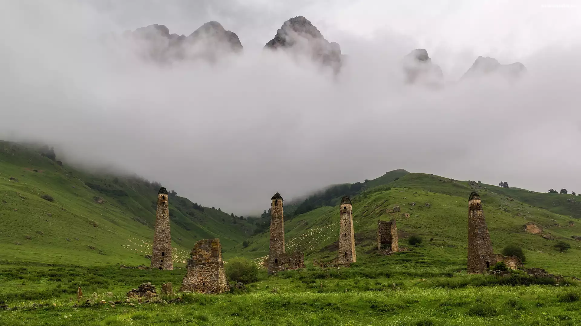 Kaukaz, Wzgórza, Wieże obronne, Skały, Rosja, Góry, Erzi, Ruiny, Inguszetia, Mgła, Drzewa na Komórkę |
