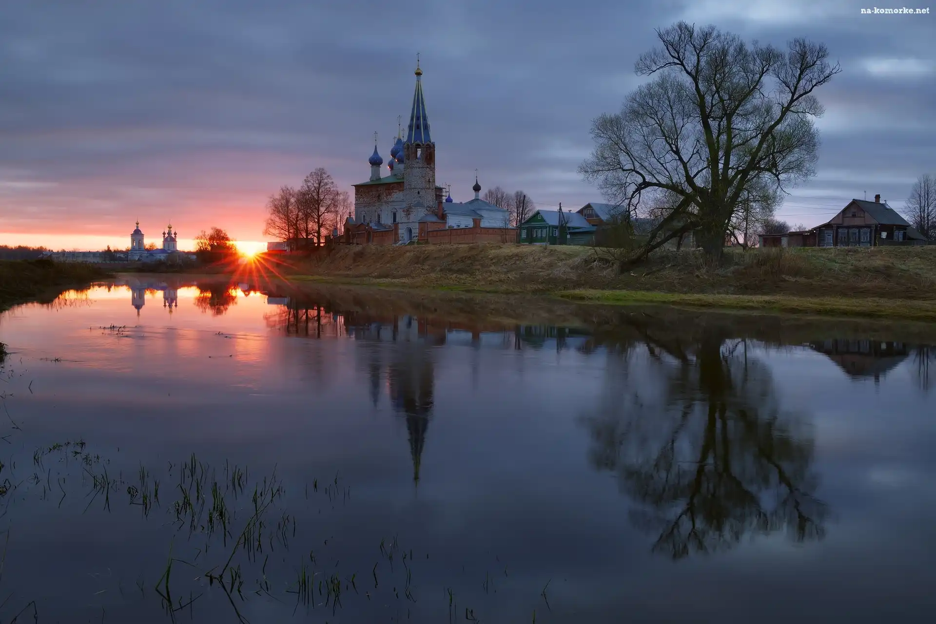 Promienie, Rzeka Teza, Drzewa, Cerkiew, Rosja, Wschód słońca, Obwód iwanowski, Domy, Dunilovo na Komórkę |