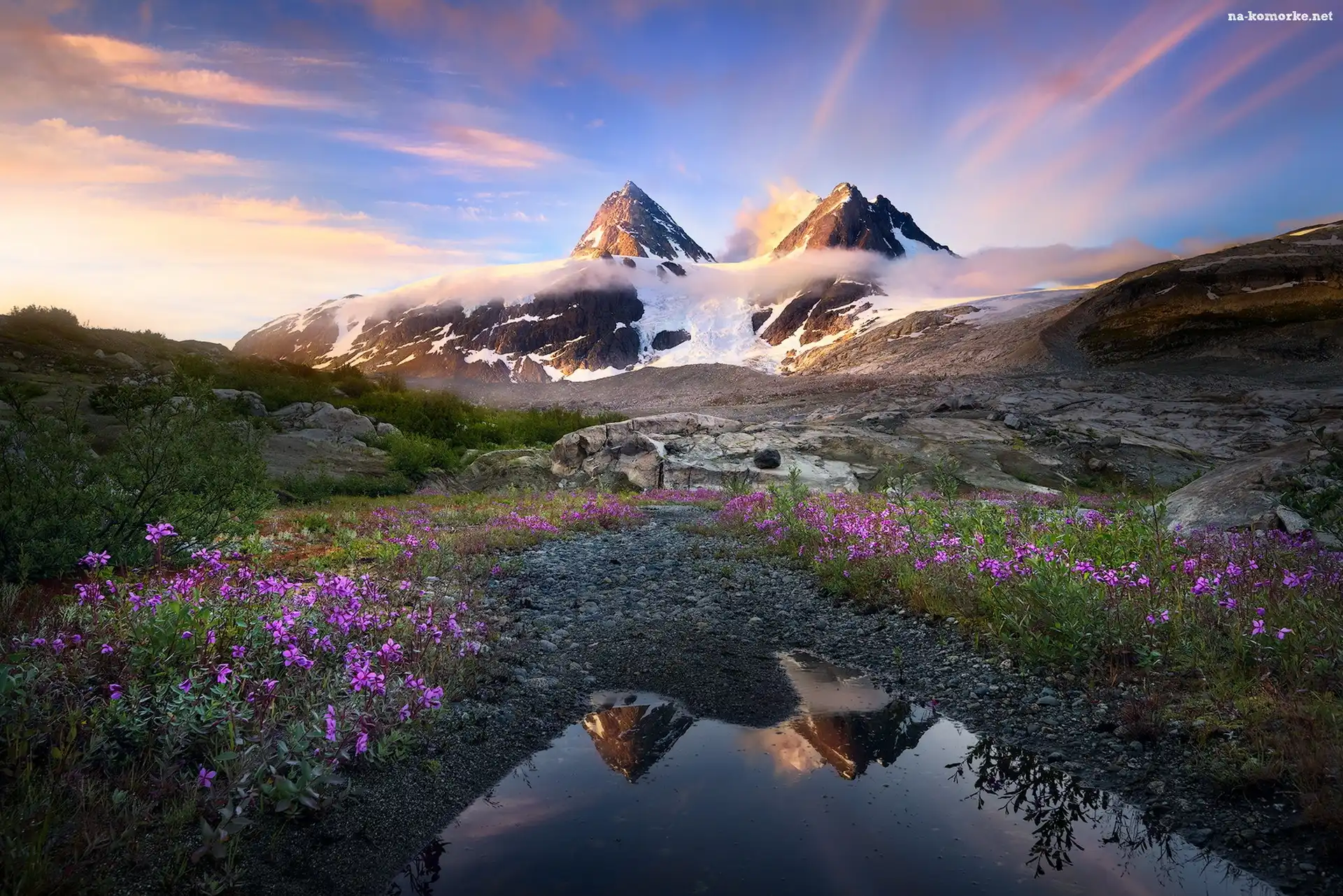 Roślinność, Śnieg, Góry, Woda, Chmury, Kwiaty na Komórkę