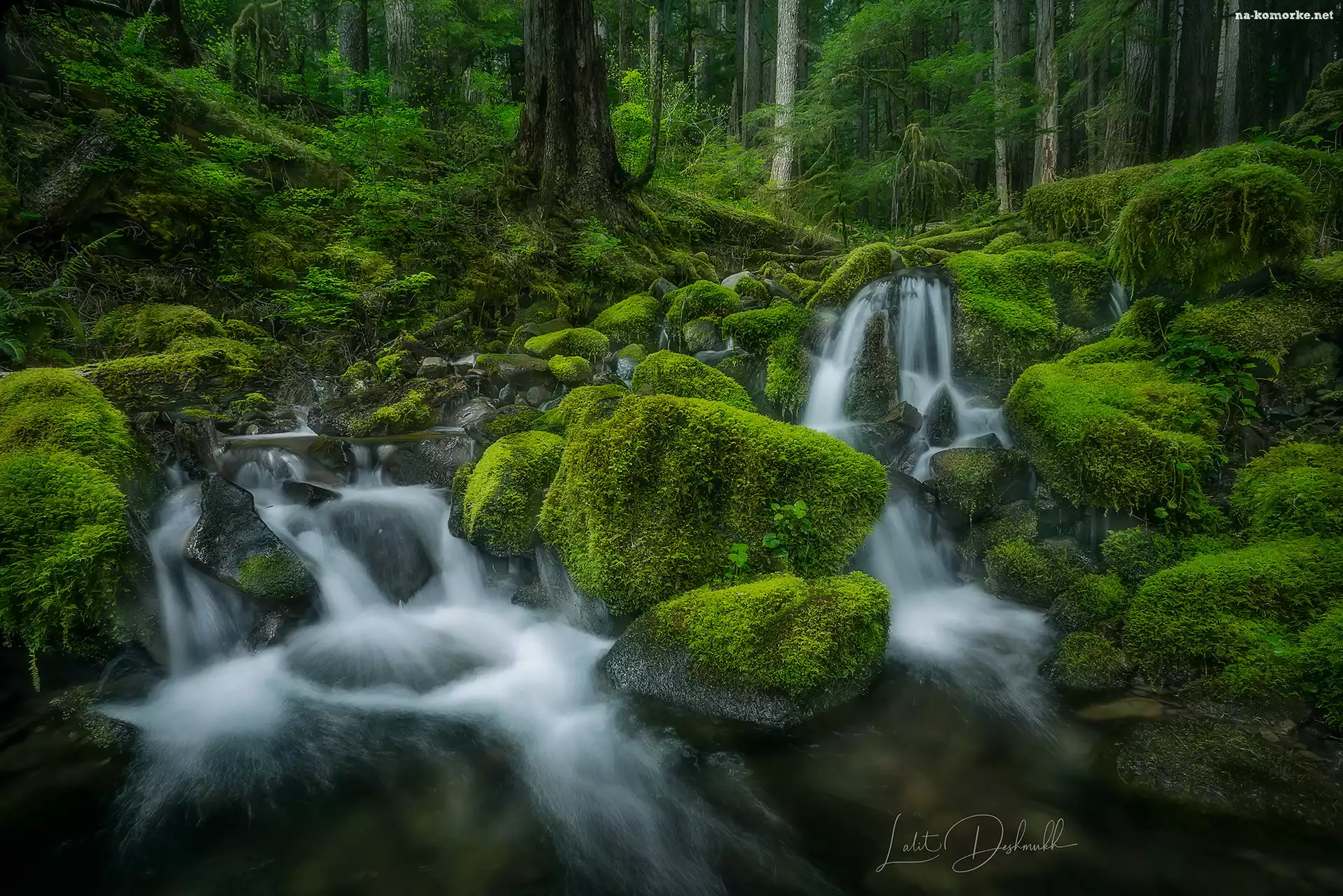 Kamienie, Las, Omszałe, Roślinność, Potok, Drzewa na Komórkę