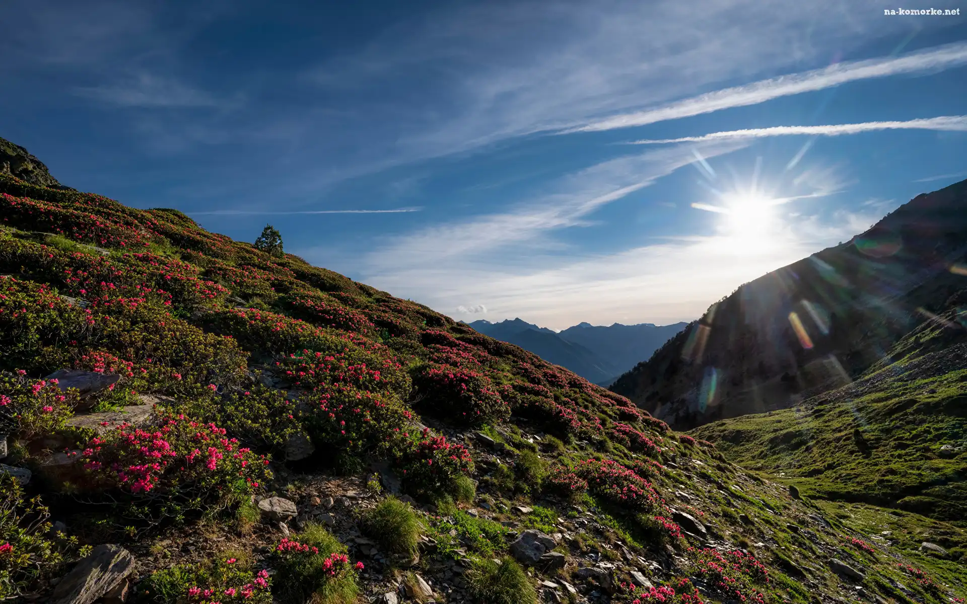 Wschód słońca, Góry, Roślinność, Kwiaty, Andora, Pireneje, Ordino, Łąka, Park Narodowy Vall de Sorteny na Komórkę |