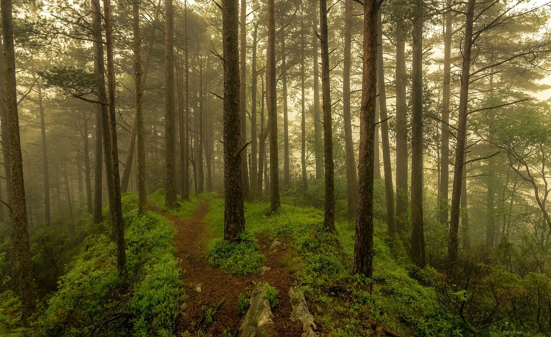 Roślinność, Las, Drzewa, Mgła, Ścieżki na Komórkę