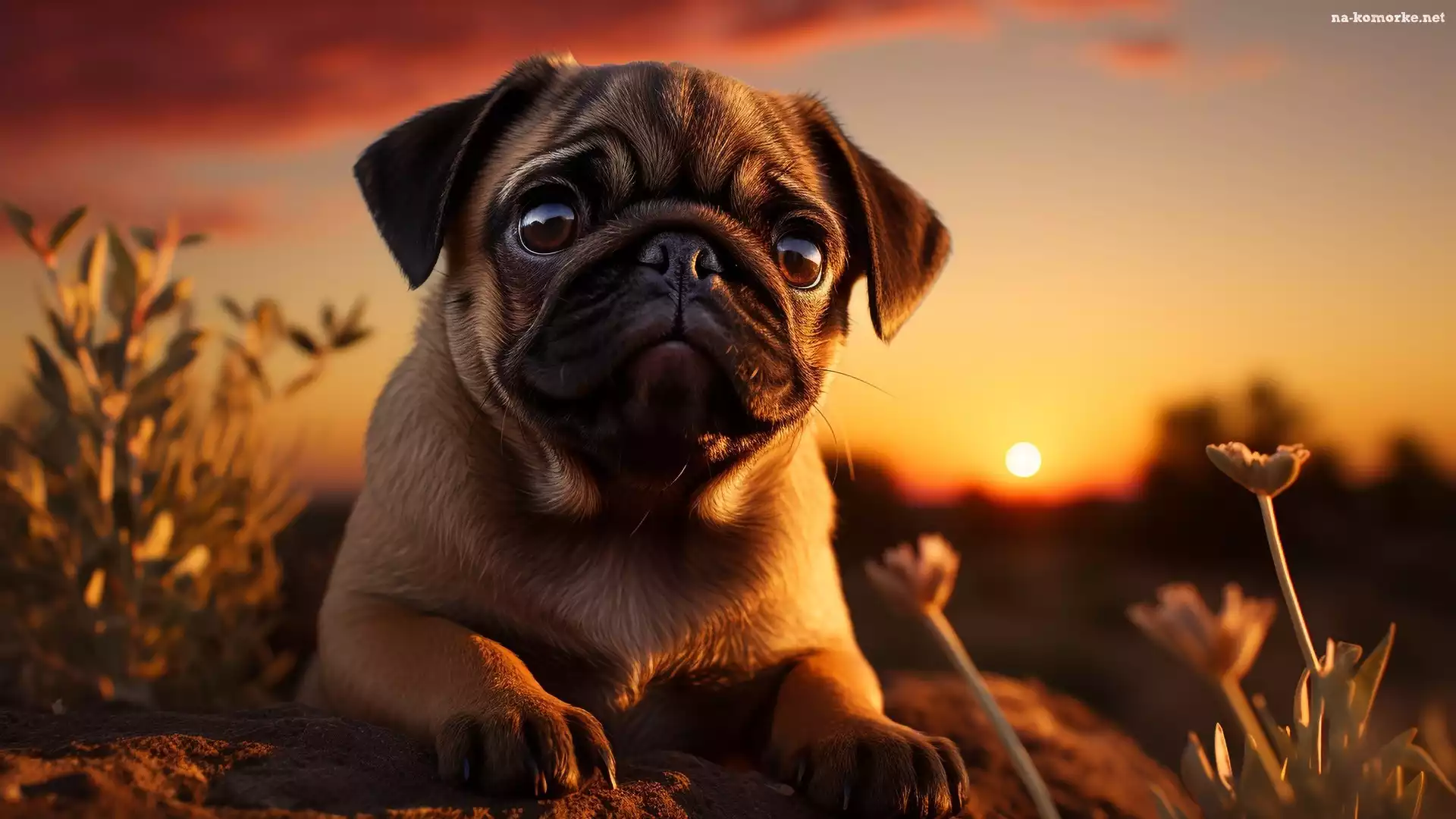 Pies, Zachód słońca, Rośliny, Mops, AI na Komórkę