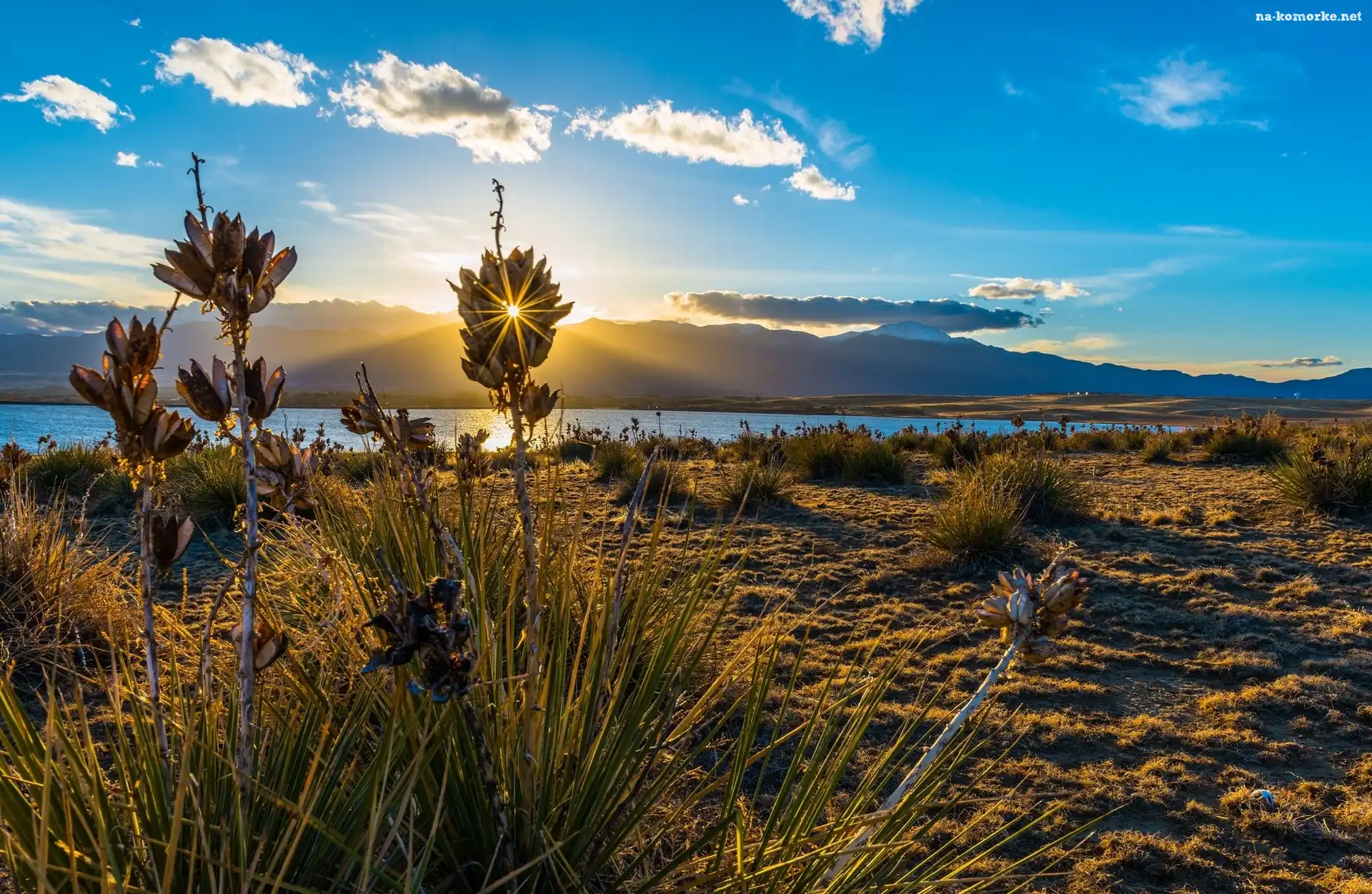 Rośliny, Zachód, Słońca, Góry, Rzeka na Komórkę