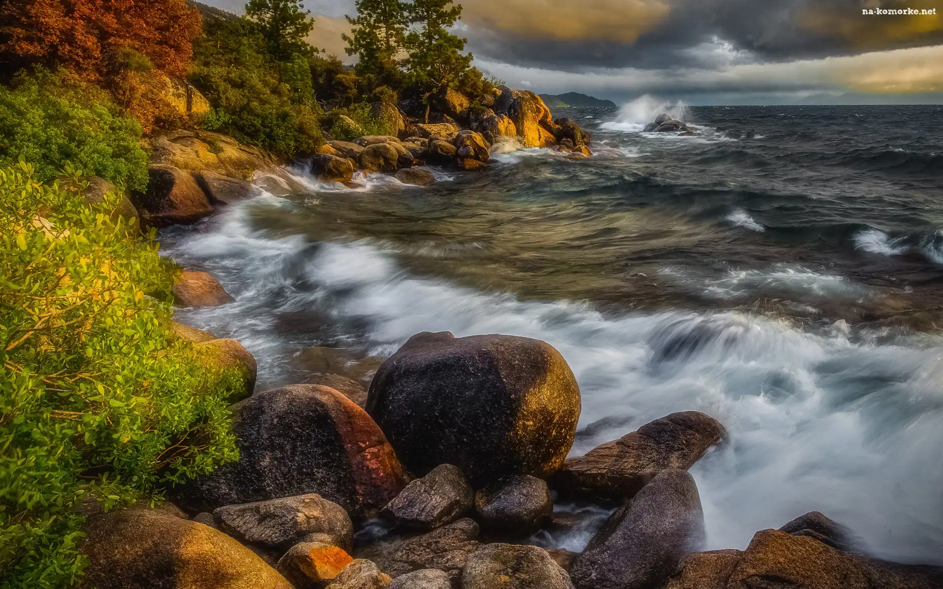 Rośliny, Chmury, Jezioro Tahoe, Stany Zjednoczone, Kamienie, Drzewa, Fale na Komórkę