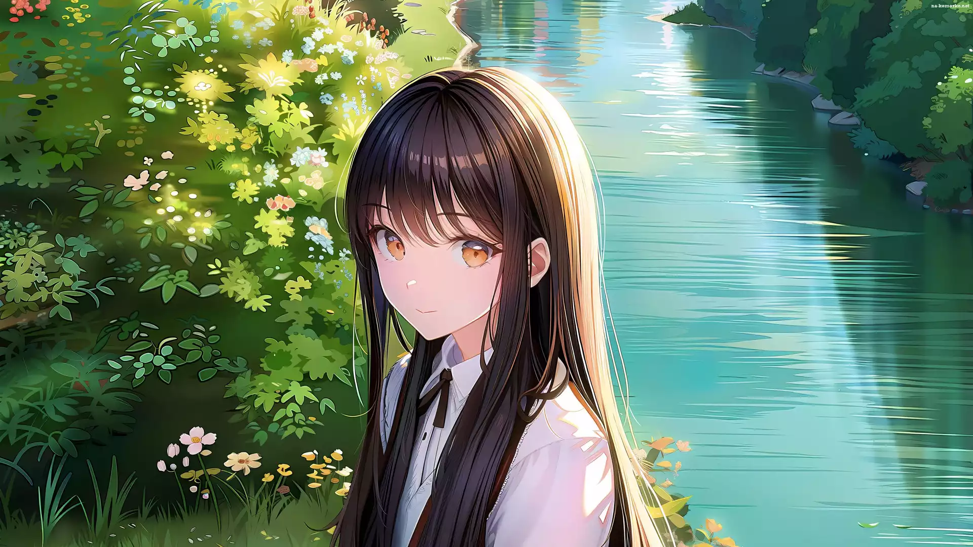 Dziewczyna, Rośliny, Kwiaty, Rzeka, Anime na Komórkę