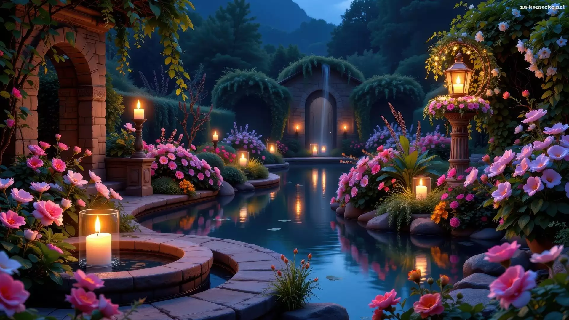 Rośliny, Różowe, Łuk, Lampion, Świece, Oczko wodne, Ogród, Kwiaty, Murowany na Komórkę