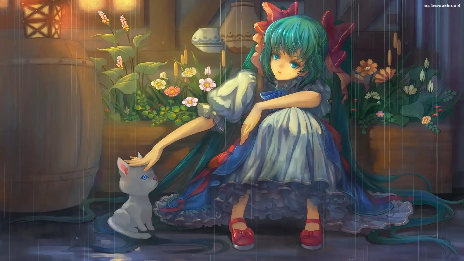 Dziewczynka, Lampa, Anime, Beczka, Manga, Deszcz, Kot, Wazony, Kwiaty, Rośliny na Komórkę