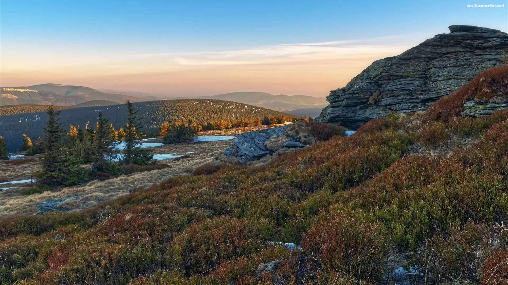 Drzewa, Góry Jesioniki, Poranek, Czechy, Skały, Rośliny na Komórkę