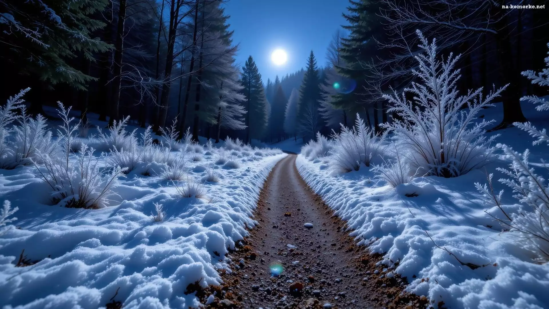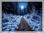 Rośliny, Oszronione, Zima, Księżyc, Las, Noc, Drzewa, Droga, Śnieg, AI na Komórkę