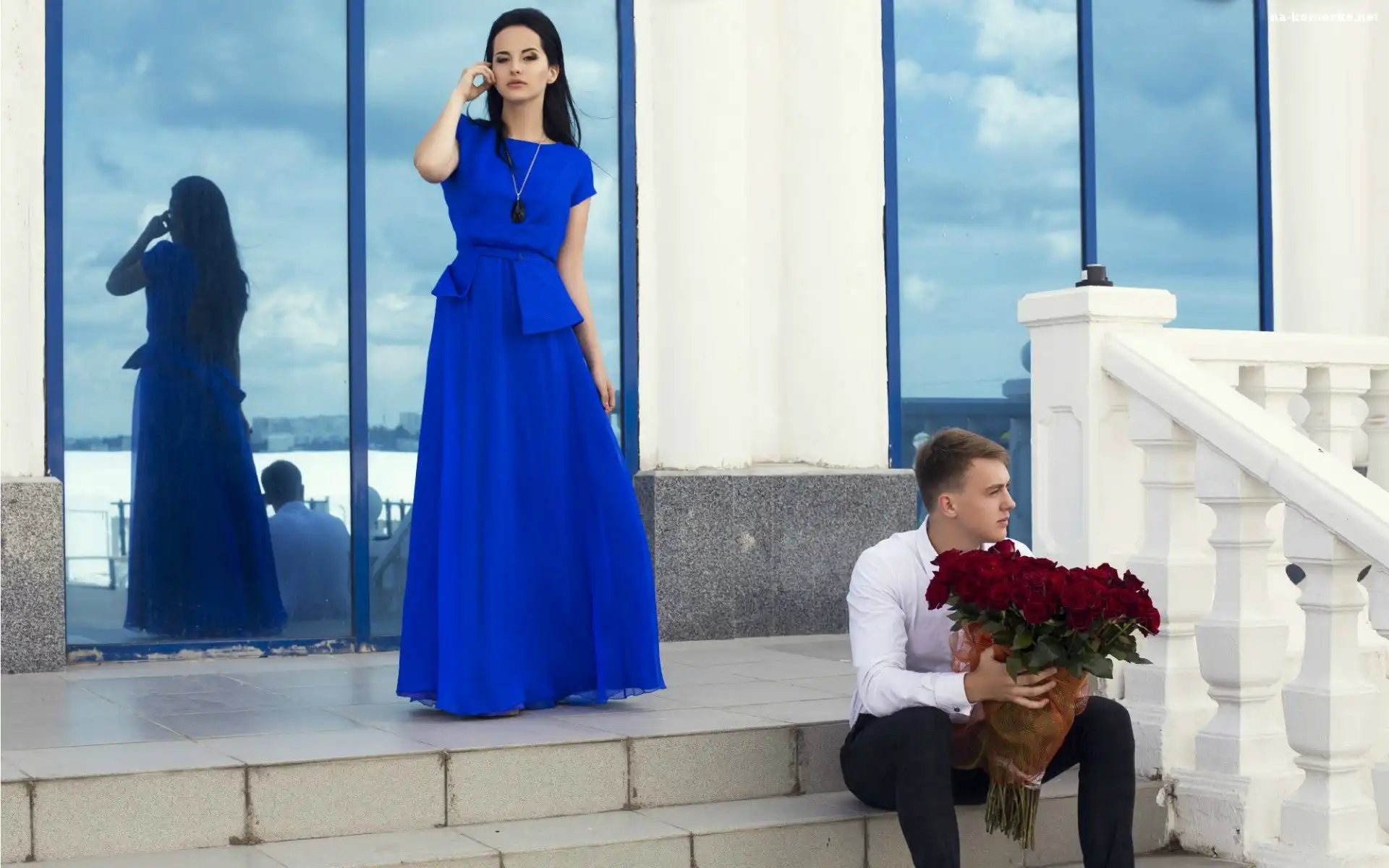Róż, Mężczyzna, Kobieta, Schody, Bukiet, Budynek na Komórkę