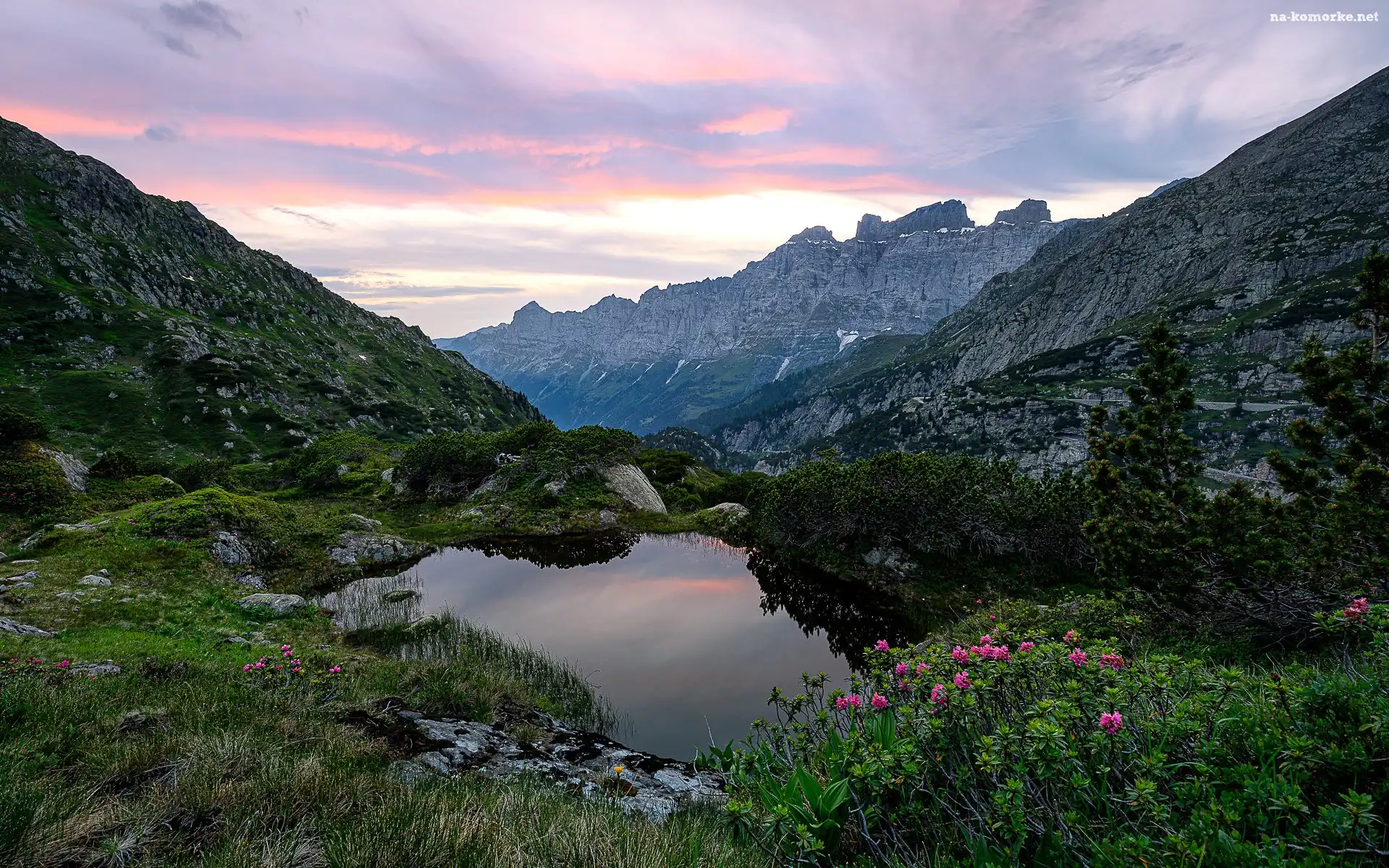 Różanecznik, Drzewa, Góry, Kałuża, Kwiaty, Woda na Komórkę