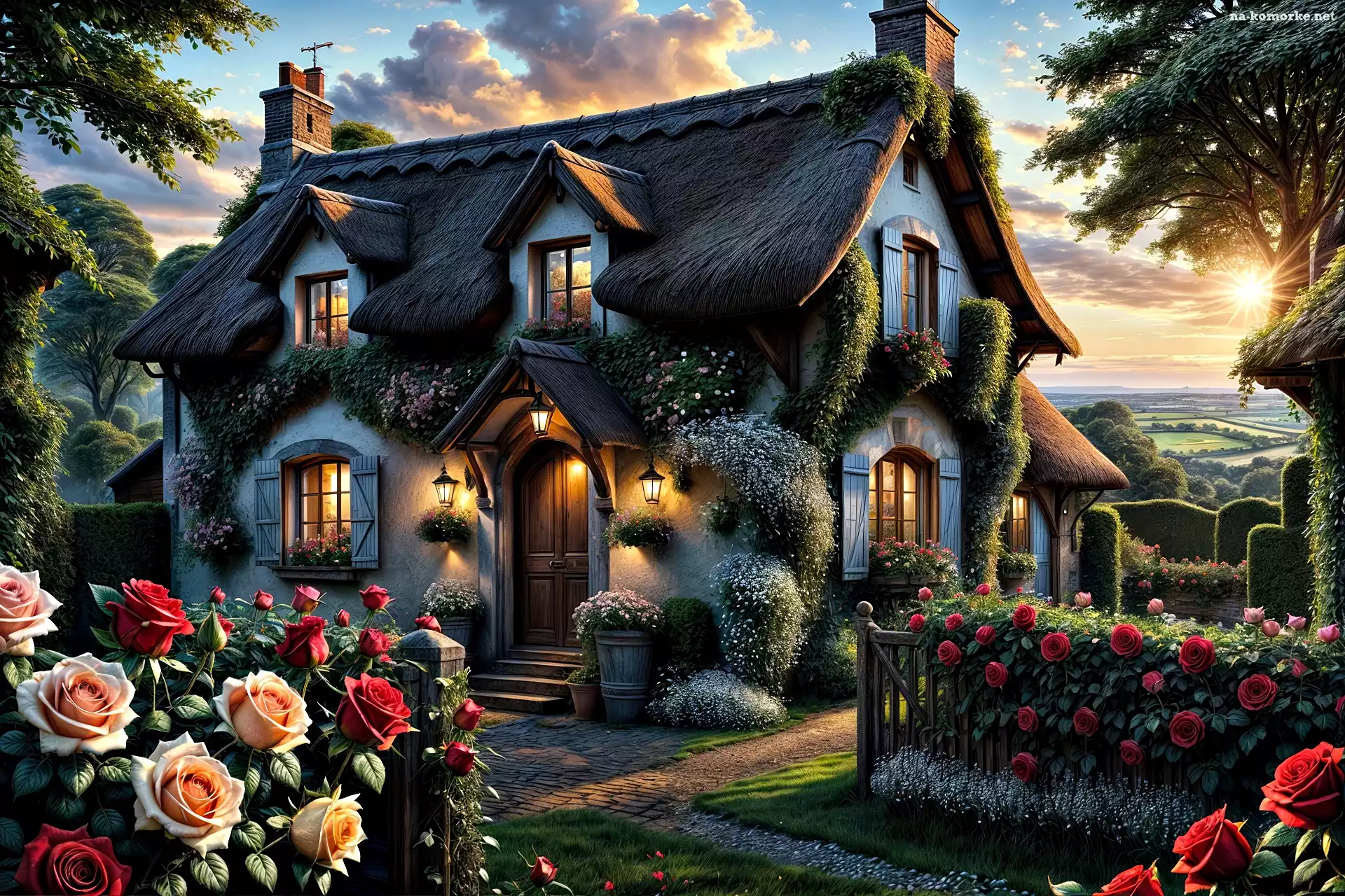 Promienie słońca, Dom, Róże, Grafika, Kwiaty, Ogród na Komórkę
