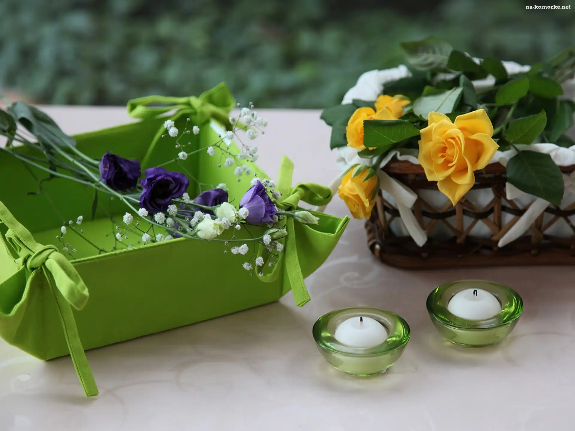 Świece, Kompozycja, Żółte, Róże, Koszyk na Komórkę