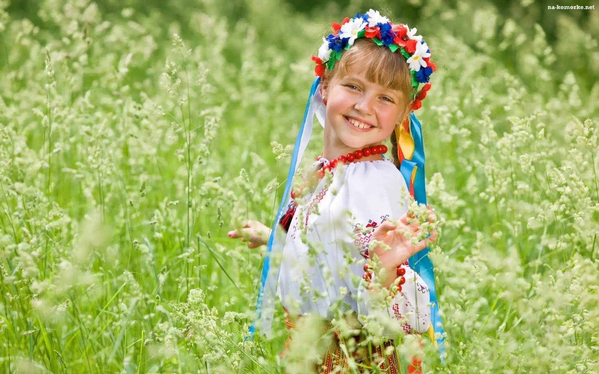 Roześmiana, Łąka, Dziewczynka, Wianek na Komórkę