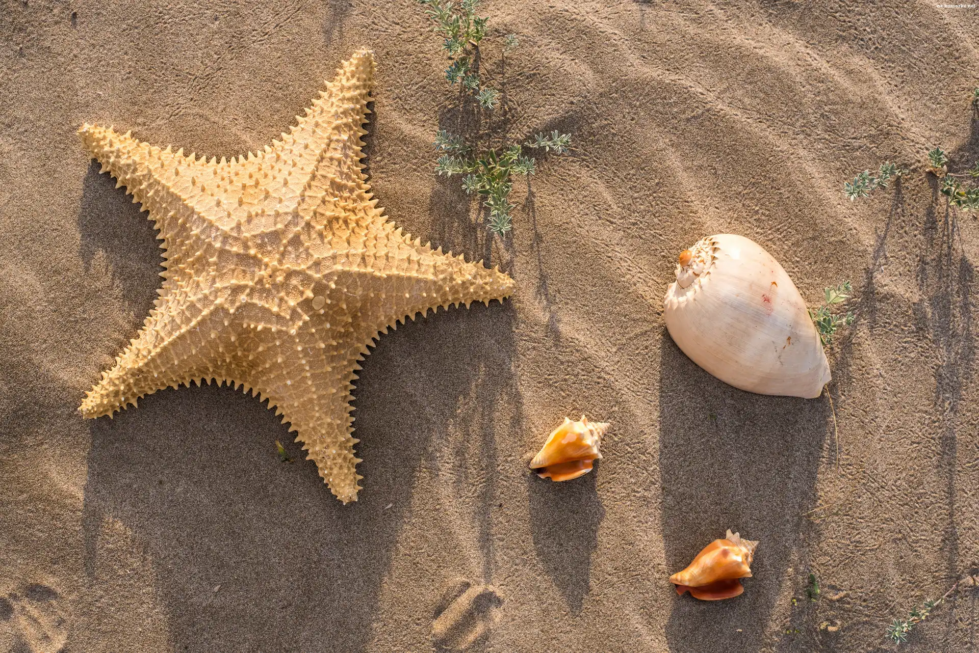 Rozgwiazda, Piasek, Muszelki, Rośliny na Komórkę