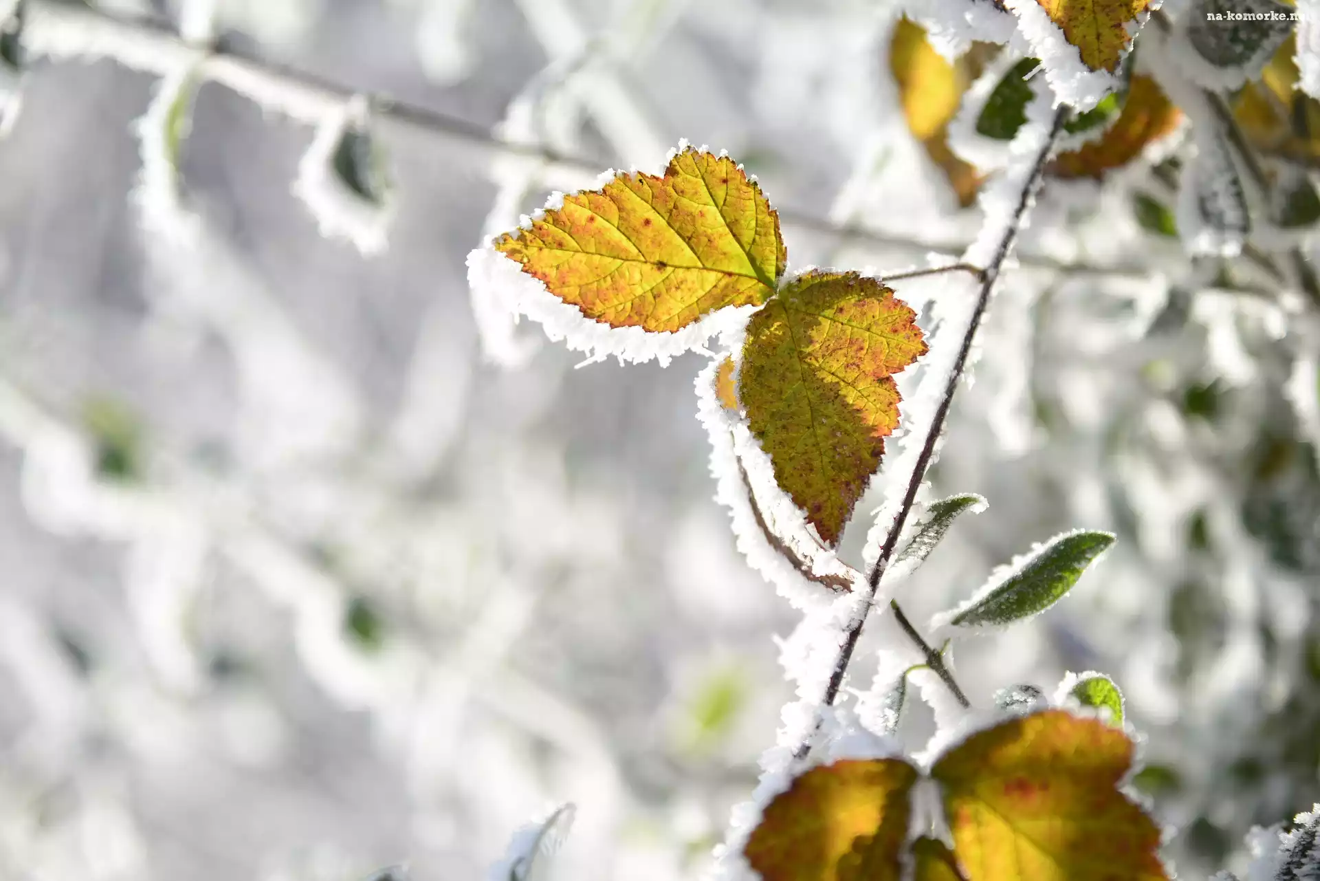 Rozmyte tło, Pożółkłe, Liście, Gałązka, Szron na Komórkę