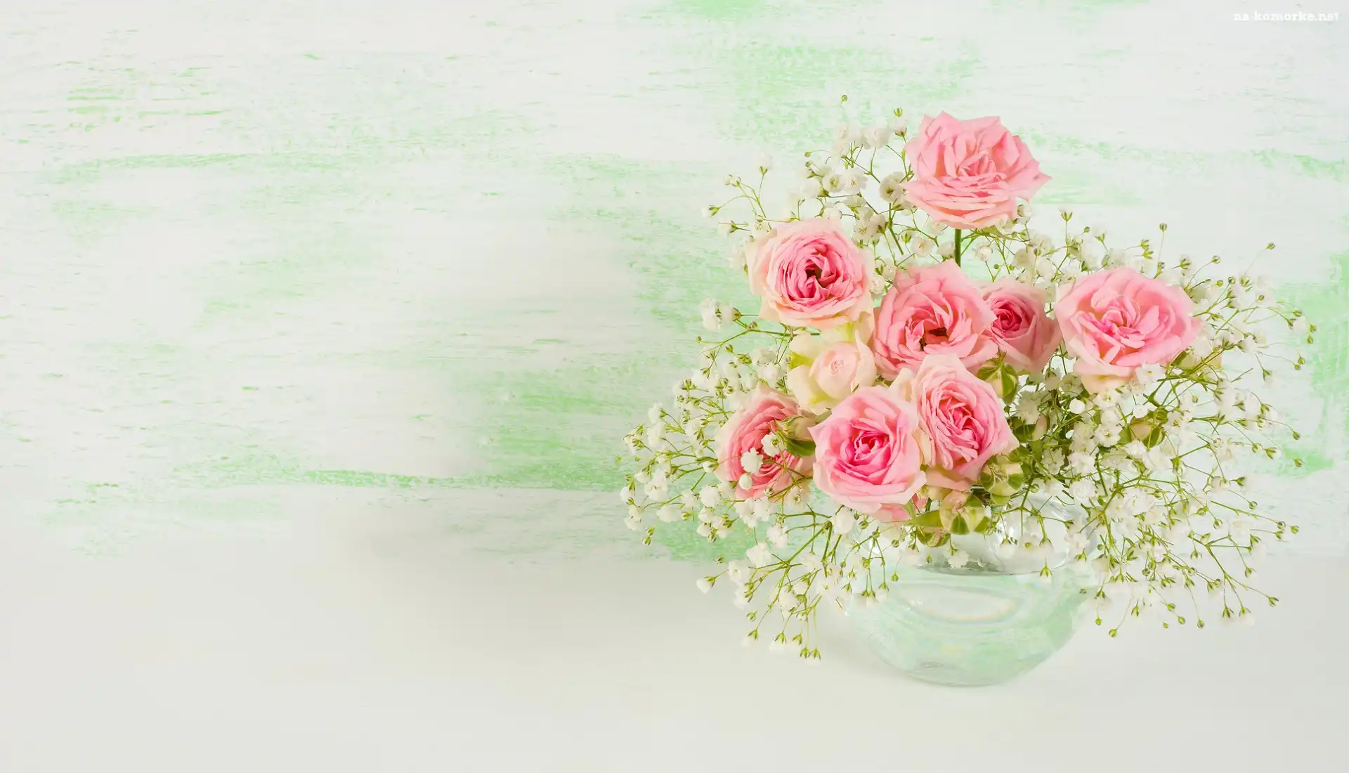 Różowe, Wazonik, Szklany, Gipsówka, Bukiet, Róże na Komórkę