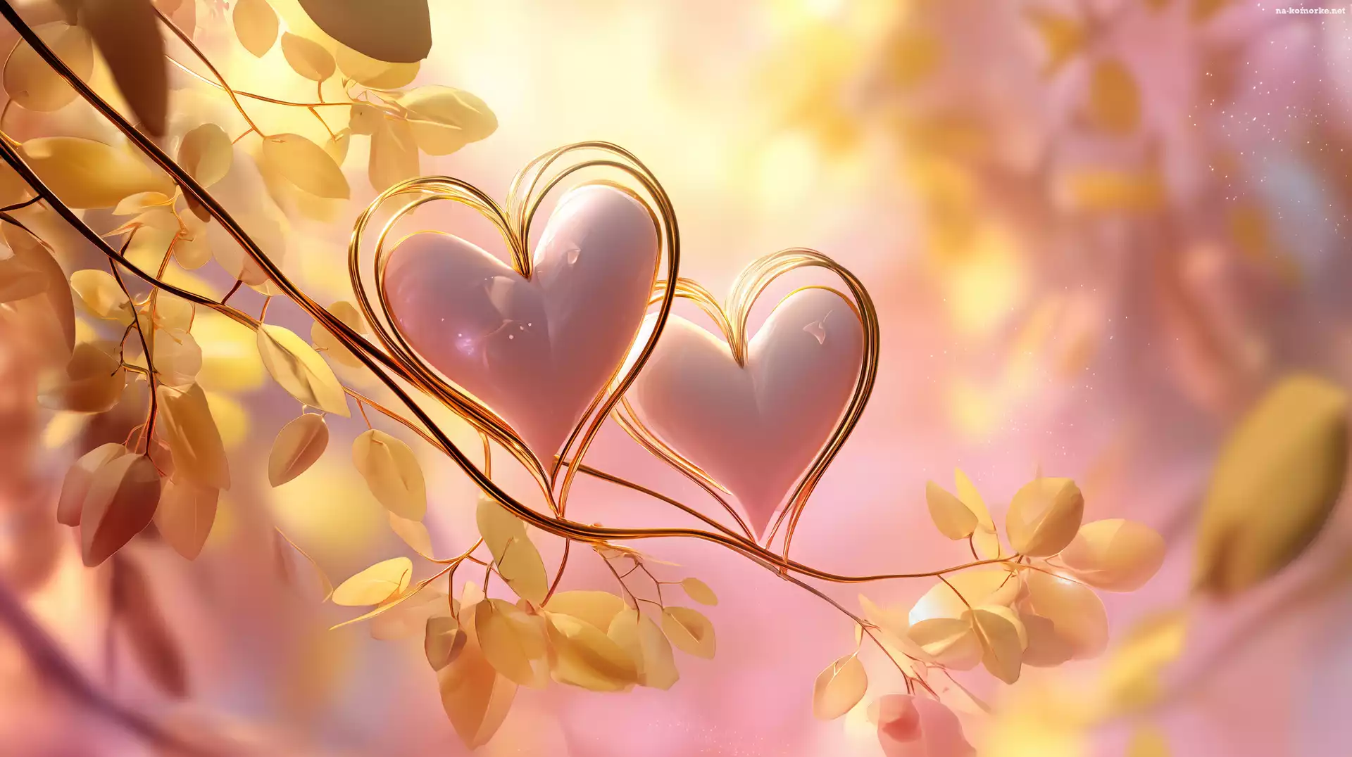 Żółte, Liście, Dwa, Grafika AI, Serca, Gałązka, Różowe na Komórkę