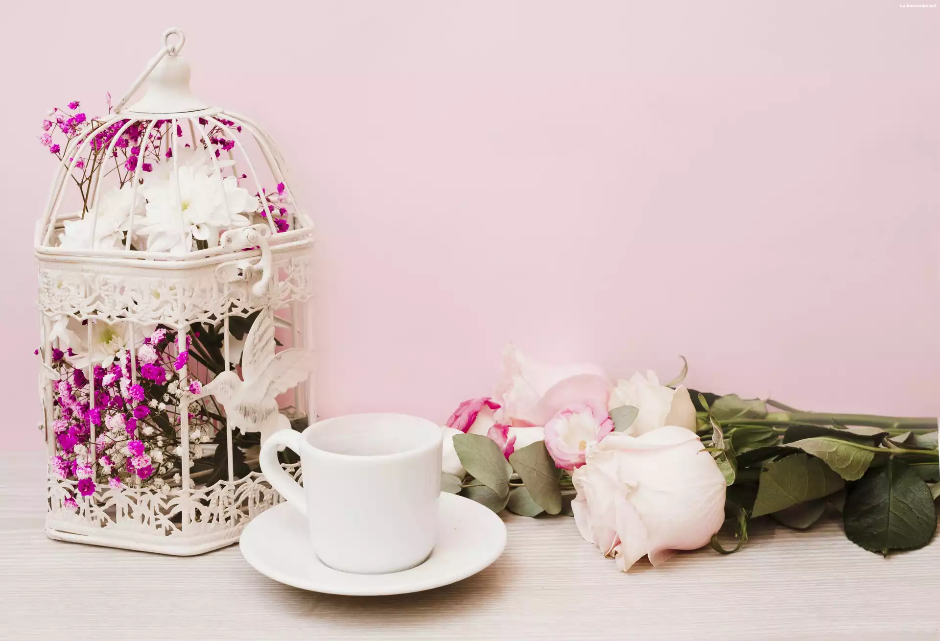 Kompozycja, Różowe, Róże, Kwiaty, Klatka, Biała, Filiżanka na Komórkę