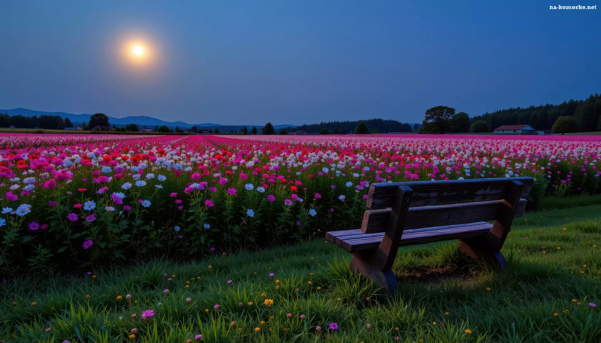 Ławka, Różowe, Kwiaty, Białe, Księżyc na Komórkę