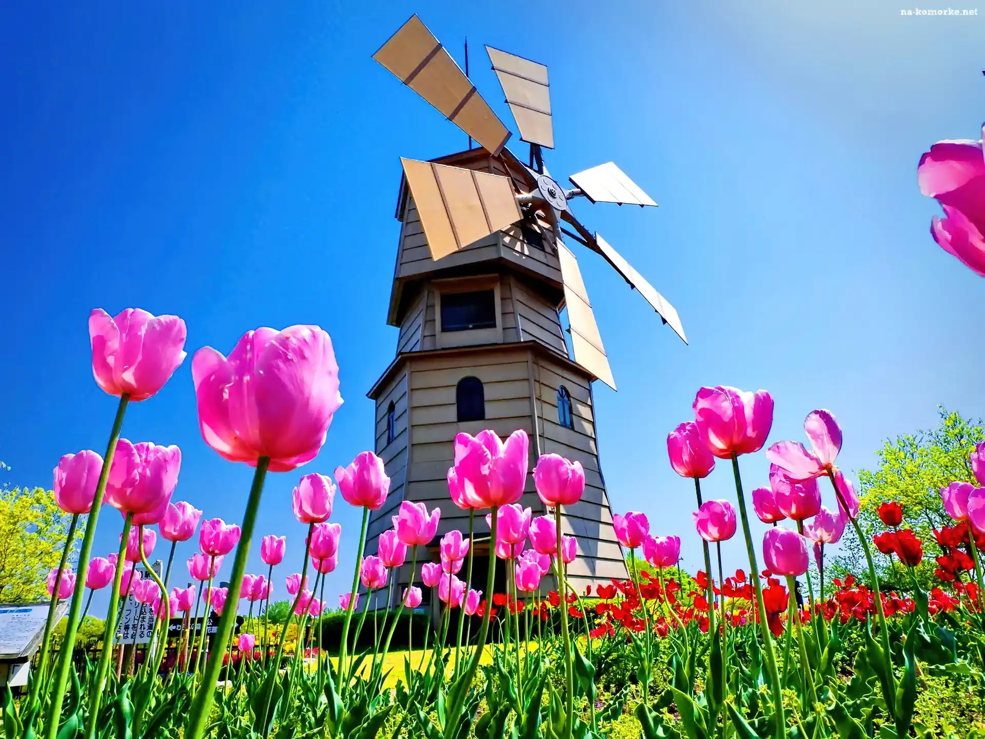 Łąka, Wiatrak, Różowe, Tulipany na Komórkę