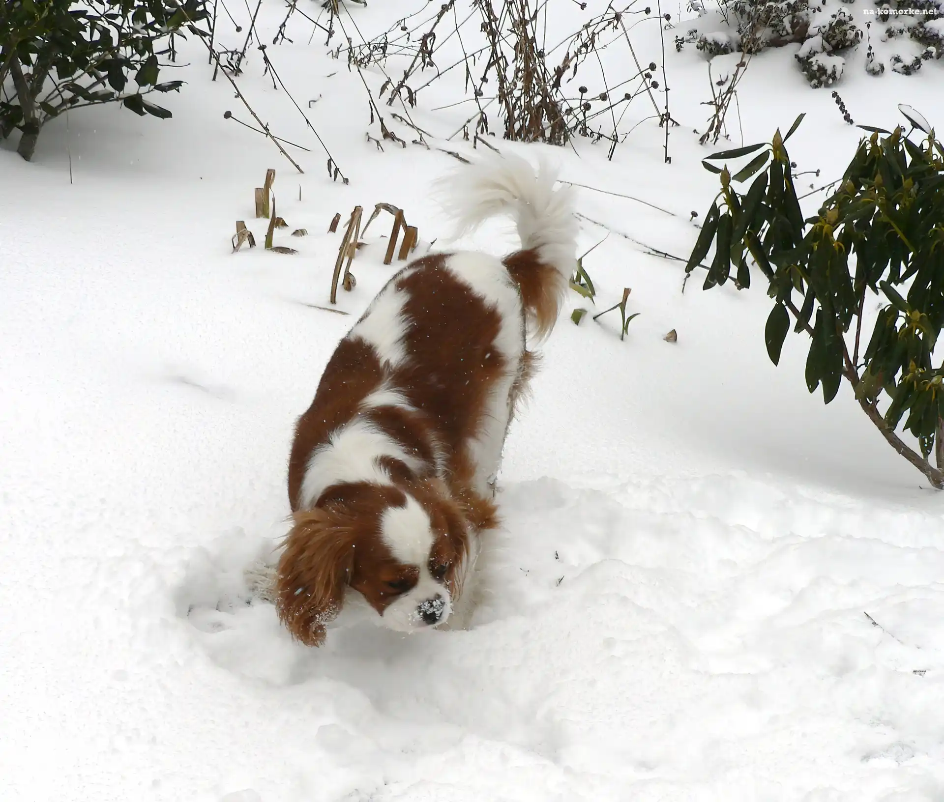 Rudo-biały, King Charles Spaniel, śnieg na Komórkę