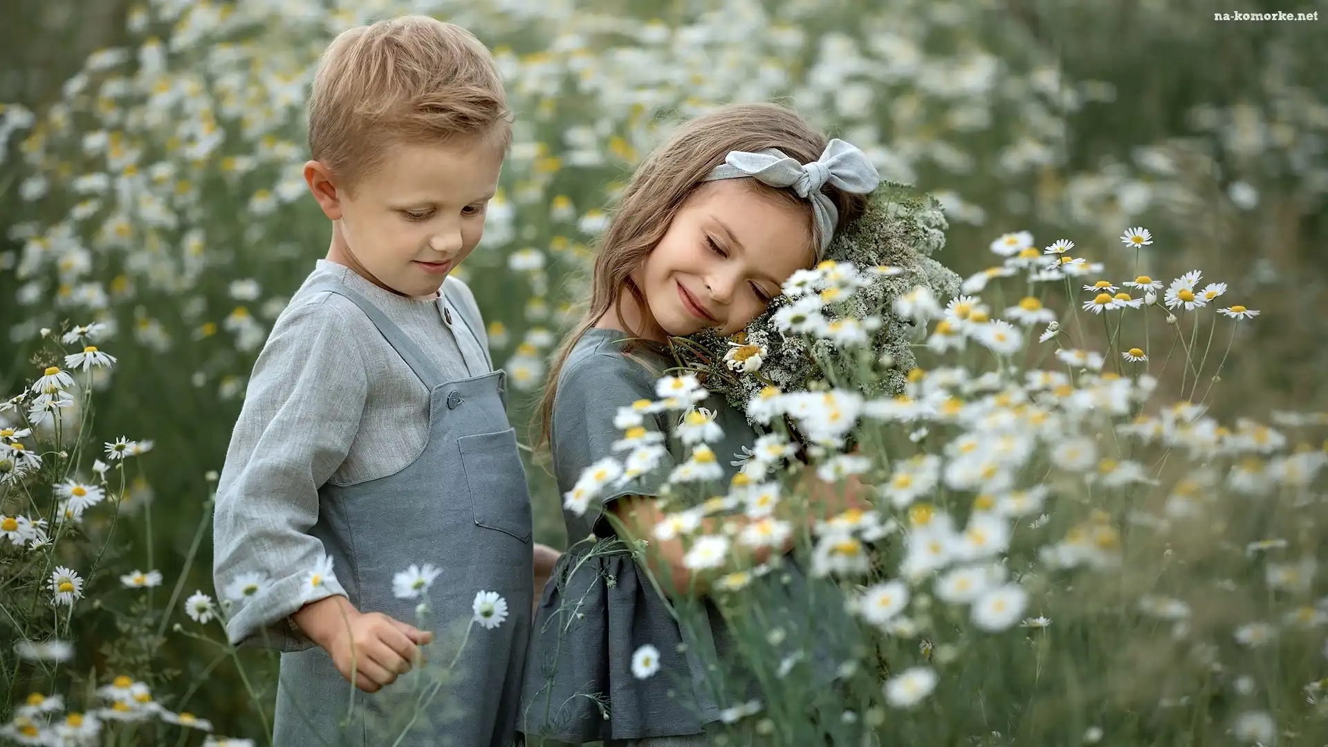 Rumiany, Chłopiec, Dziewczynka, Łąka, Kwiaty na Komórkę