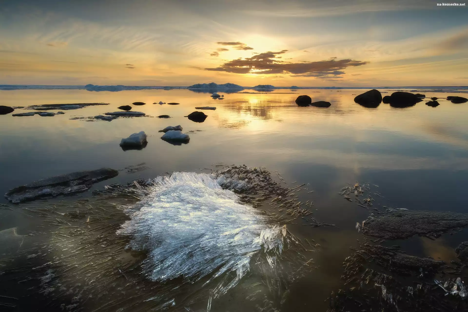 Lód, Obwód jarosławski, Rosja, Zima, Wschód słońca, Jezioro, Zbiornik Rybiński na Komórkę