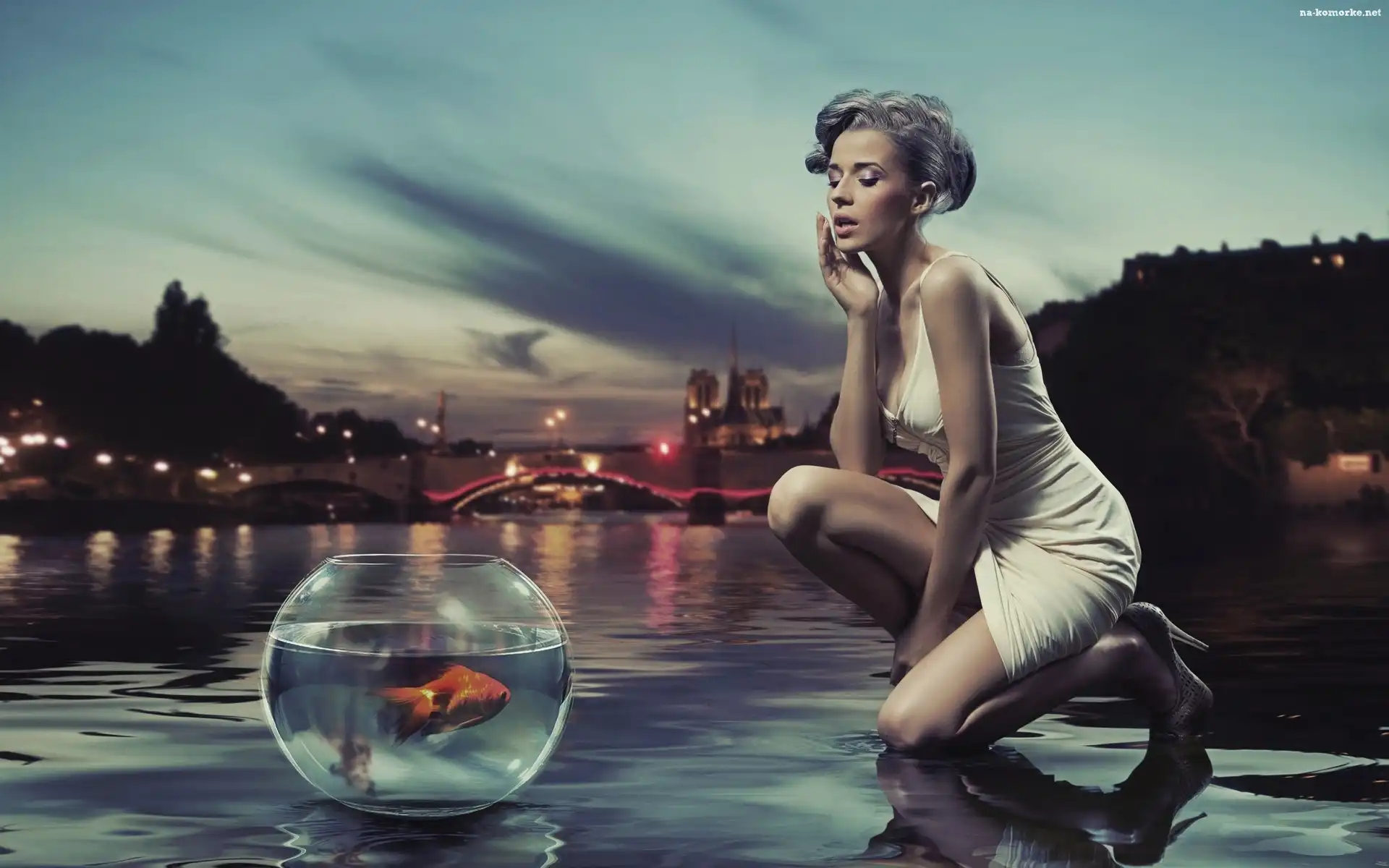 Rybka, Woda, Miasto, Kobieta, Akwarium, Ładna na Komórkę