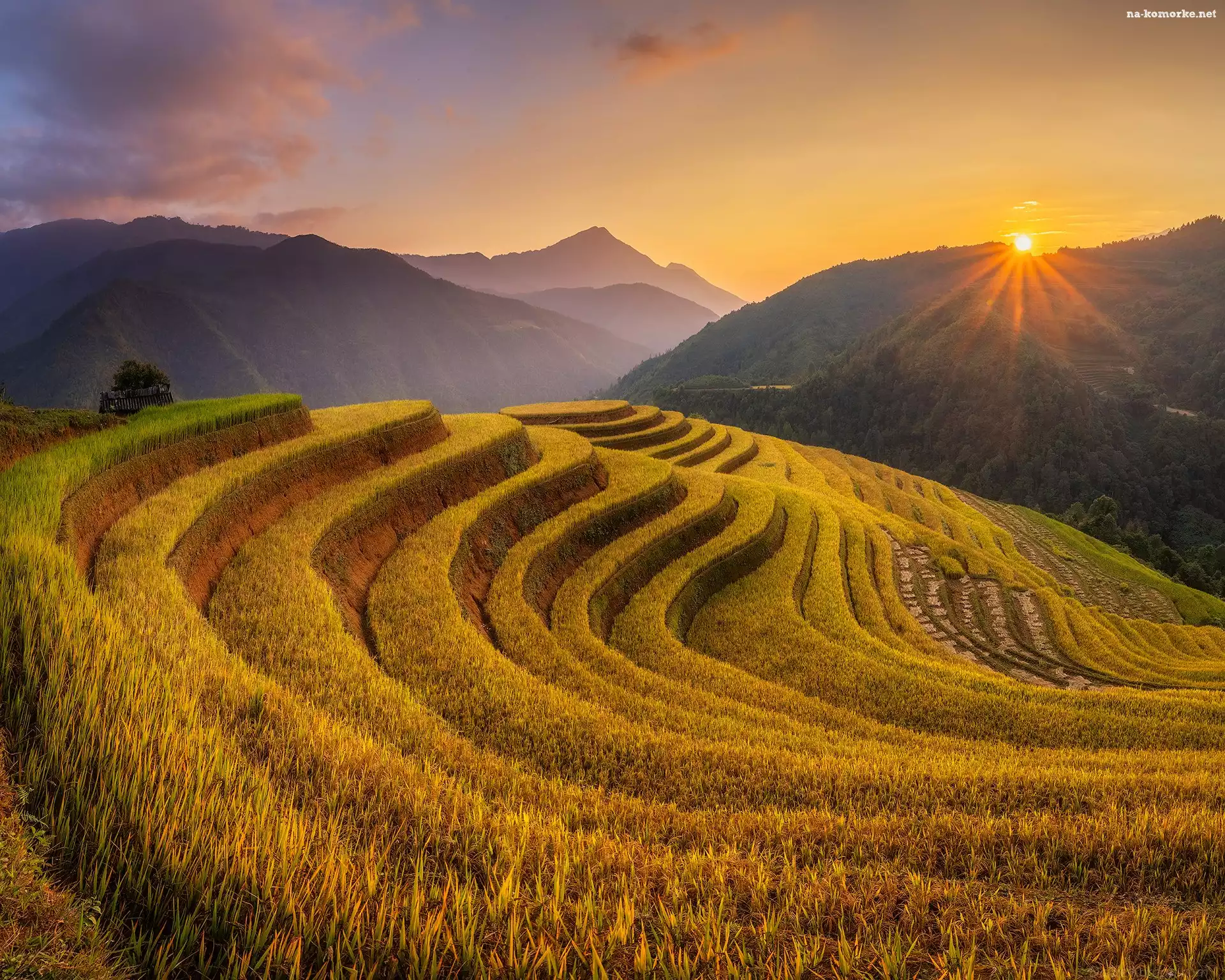 Promienie słońca, Pola, Lasy, Wietnam, Góry, Tarasy ryżowe na Komórkę