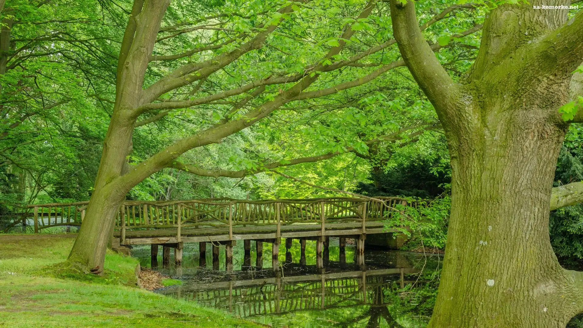 Rzeczka, Park, Zielone, Drzewa, Mostek na Komórkę