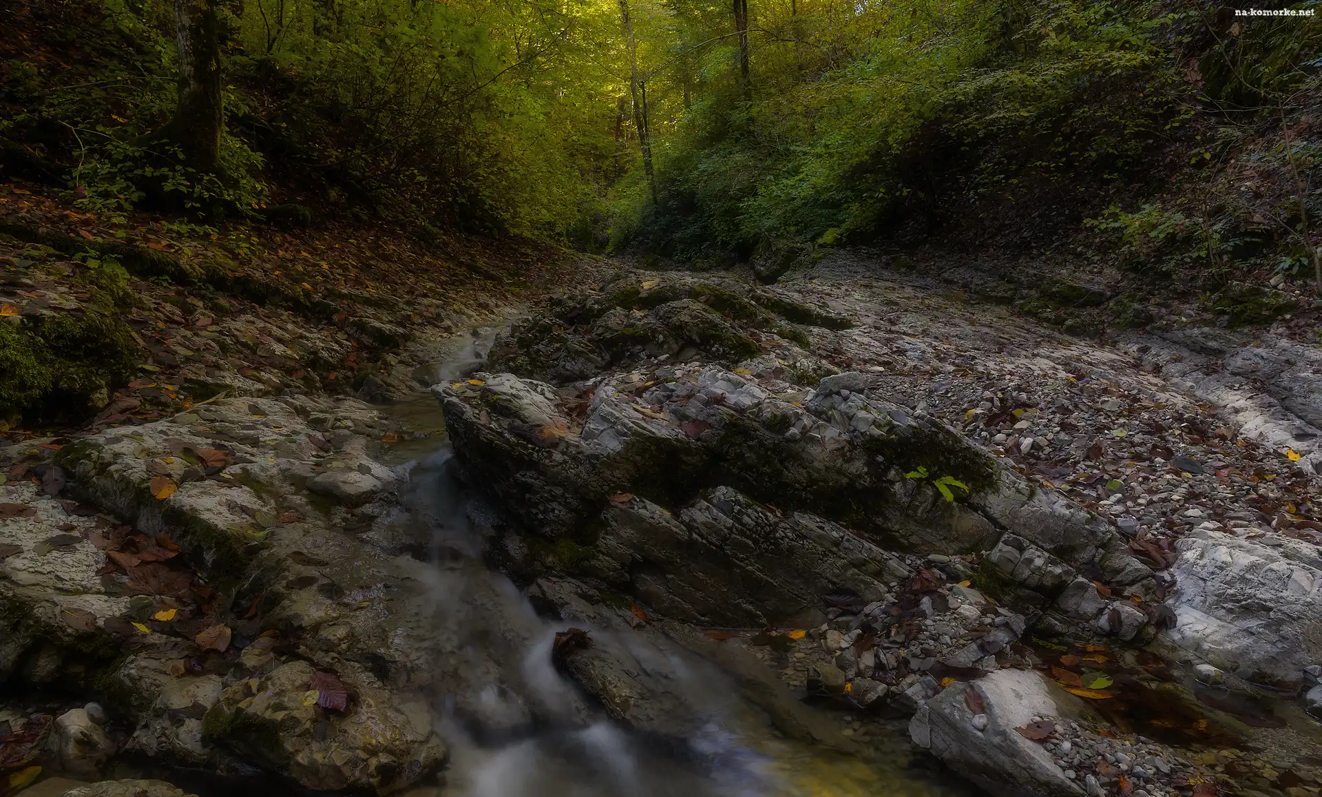 Rzeczka, Las, Drzewa, Skały, Kamienie na Komórkę